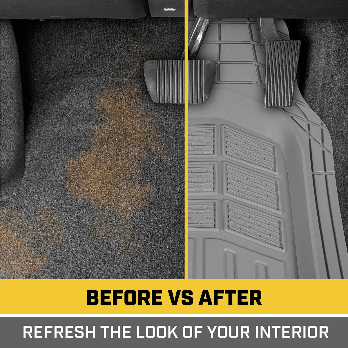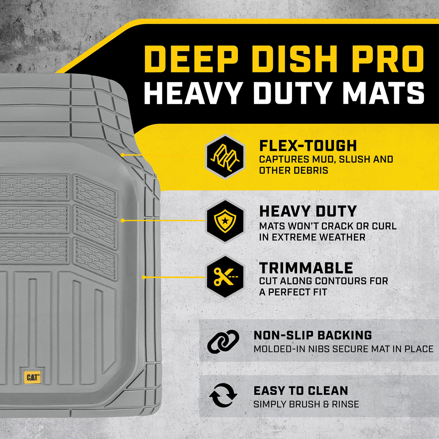 Cat Truck & Car Front & Rear Floor Mats Set Full Set:Caterpillar Automotive offers the ultimate protection for your vehicles interior, making it an essential addition to your collection of truck accessories for men and women. Designed to provide high-quality, durable coverage, these car floor mats all weather design are perfect for anyone who wants to protect their vehicle from the elements, dirt, and debris. Whether you drive a pickup truck, car, SUV, min-van or even a semi-truck, these rubber mats for floor protection are the ideal choice to keep your car interior looking pristine.The advanced all-weather all season car floor mats design stand up to snow, rain, mud, and more, making them a reliable choice for protecting your car floors. The tough, slip-resistant surface ensures that debris stays trapped, while the high-quality rubber construction provides a firm grip, keeping the mats securely in place.These floor mats are not just for everyday cars, but also make great heavy duty truck and semi truck accessories, providing the protection truck drivers need and make an excellent choice for truck interior car rugs accessories. With the versatility to fit a wide range of vehicles, these mats offer exceptional interior car accessories that are both practical and stylish. These mats are the perfect solution for keeping your vehicle clean and protected during winter.A few examples of car or truck make and models these mud flaps will fit include: Ford (F150, F250, F350, Explorer, Ranger, Escape, Expedition, Fusion, Lightning Mustang), Toyota (Tacoma, Rav4, Highlander, Prius, Tundra, Camry, Corolla), Chevrolet (Silverado, Chevy Colorado, Traverse) Dodge (Ram, Charger, Challenger, Durango, Journey), Honda (Civic, Accord, CR-V, Pilot, Odyssey, HR-V), Nissan (Rogue, Altima, Frontier, Titan), Jeep (Wrangler, Grand-Cherokee), Tesla (Model 3, Model Y, Model S, Model X, Cybertruck) and more!