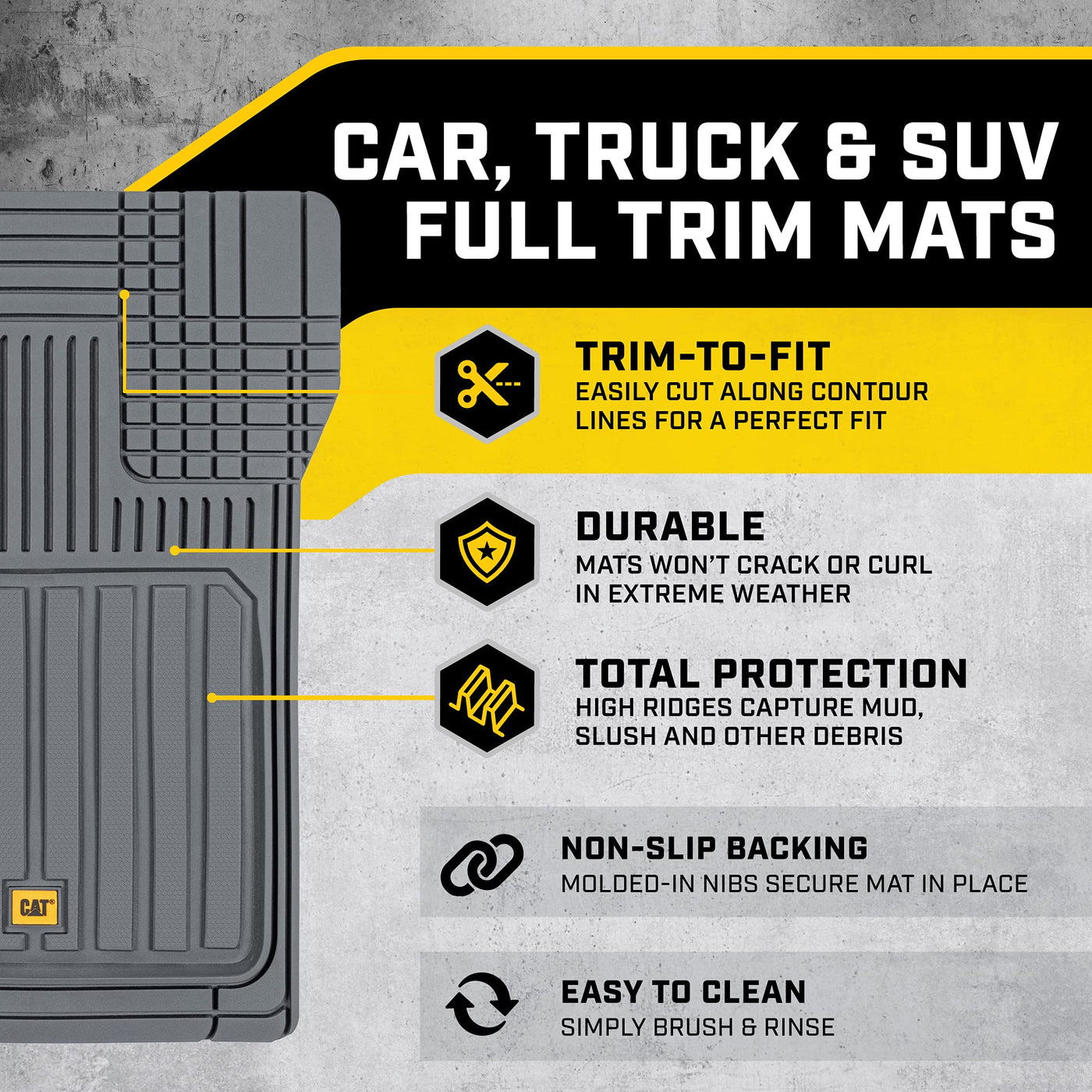 Cat ToughTread Truck & Car Front & Rear Floor Mats Set:Caterpillar Automotive offers the ultimate protection for your vehicles interior, making it an essential addition to your collection of car accessories for men and women. Designed to provide high-quality, durable coverage, these car floor mats all weather design are perfect for anyone who wants to protect their vehicle from the elements, dirt, and debris. Whether you drive a pickup truck, car, SUV, min-van or even a semi-truck, these rubber mats for floor protection are the ideal choice to keep your car interior looking pristine.The advanced all weather car floor mats design stand up to snow, rain, mud, and more, making them a reliable choice for protecting your car floors. The tough, slip-resistant surface ensures that debris stays trapped, while the high-quality rubber construction provides a firm grip, keeping the mats securely in place.These floor mats are not just for everyday cars, but also make great heavy duty truck and semi truck accessories, providing the protection truck drivers need and make an excellent choice for truck interior car rugs accessories . With the versatility to fit a wide range of vehicles, these mats offer exceptional interior car accessories that are both practical and stylish. Whether you're a truck driver or a commuter, these mats are the perfect solution for keeping your vehicle clean and protected.A few examples of car or truck make and models these mud flaps will fit include: Ford (F150, F250, F350, Explorer, Ranger, Escape, Expedition, Fusion, Lightning Mustang), Toyota (Tacoma, Rav4, Highlander, Prius, Tundra, Camry, Corolla), Chevrolet (Silverado, Chevy Colorado, Traverse) Dodge (Ram, Charger, Challenger, Durango, Journey), Honda (Civic, Accord, CR-V, Pilot, Odyssey, HR-V), Nissan (Rogue, Altima, Frontier, Titan), Jeep (Wrangler, Grand-Cherokee), Tesla (Model 3, Model Y, Model S, Model X, Cybertruck) and more!