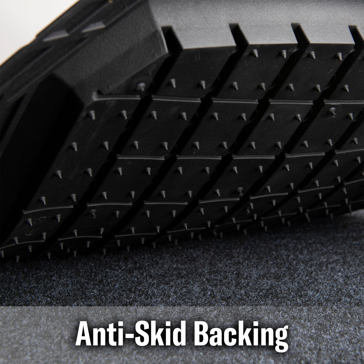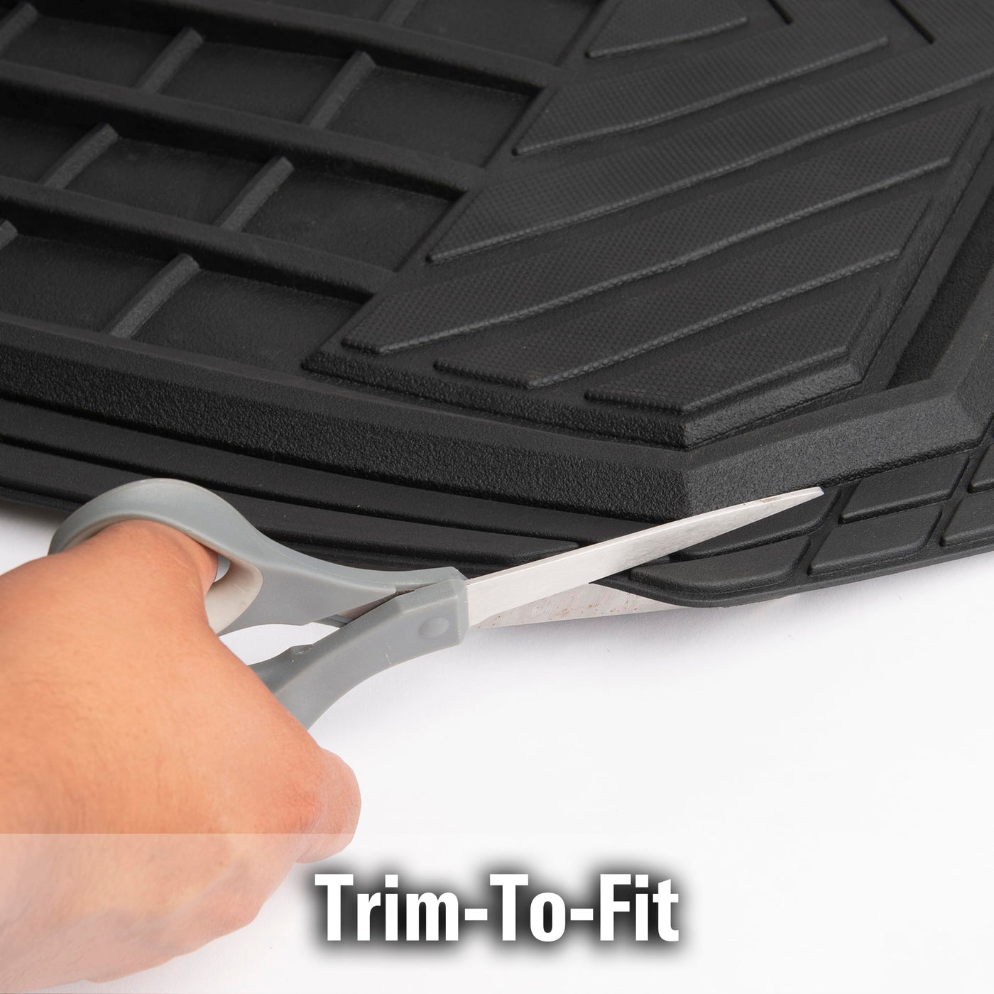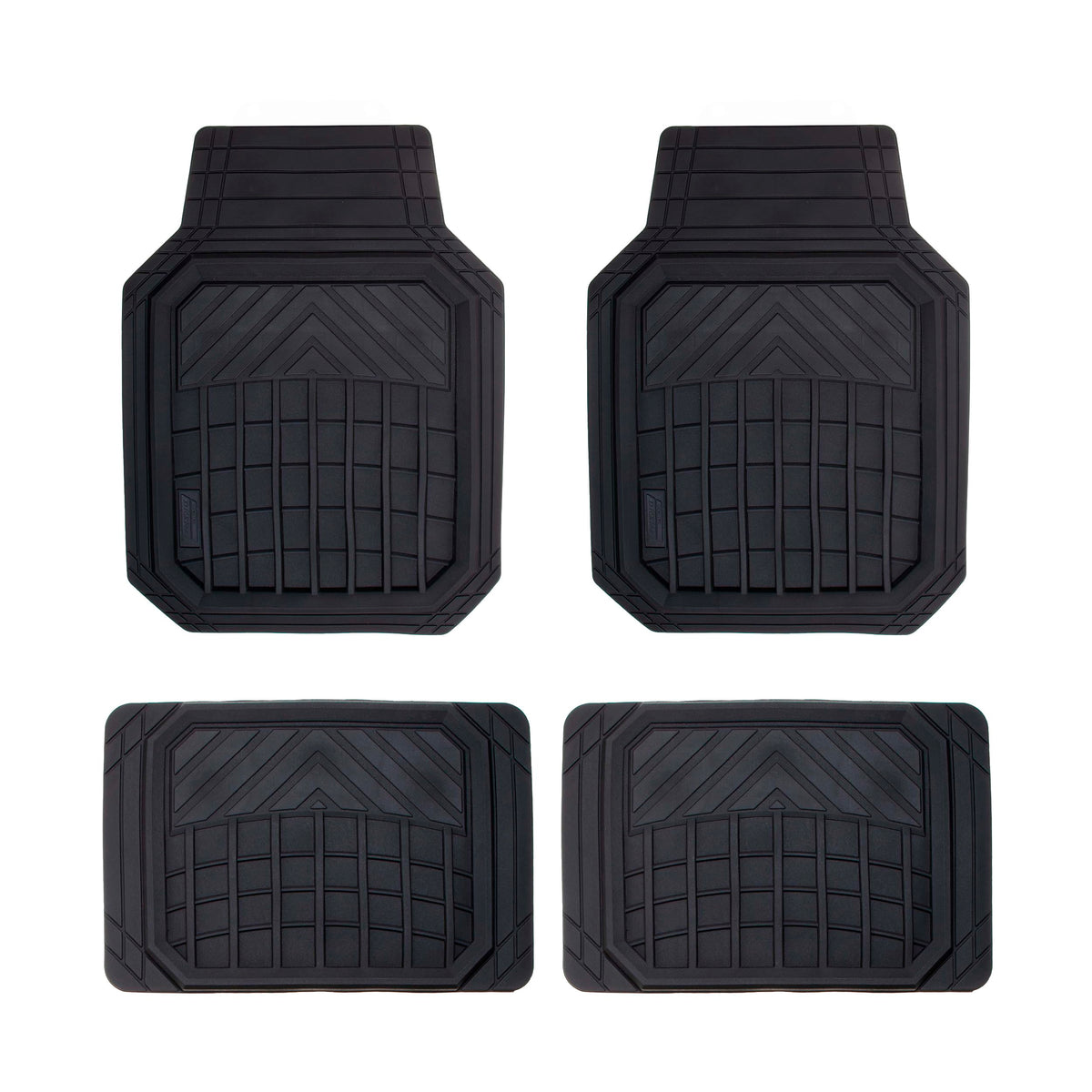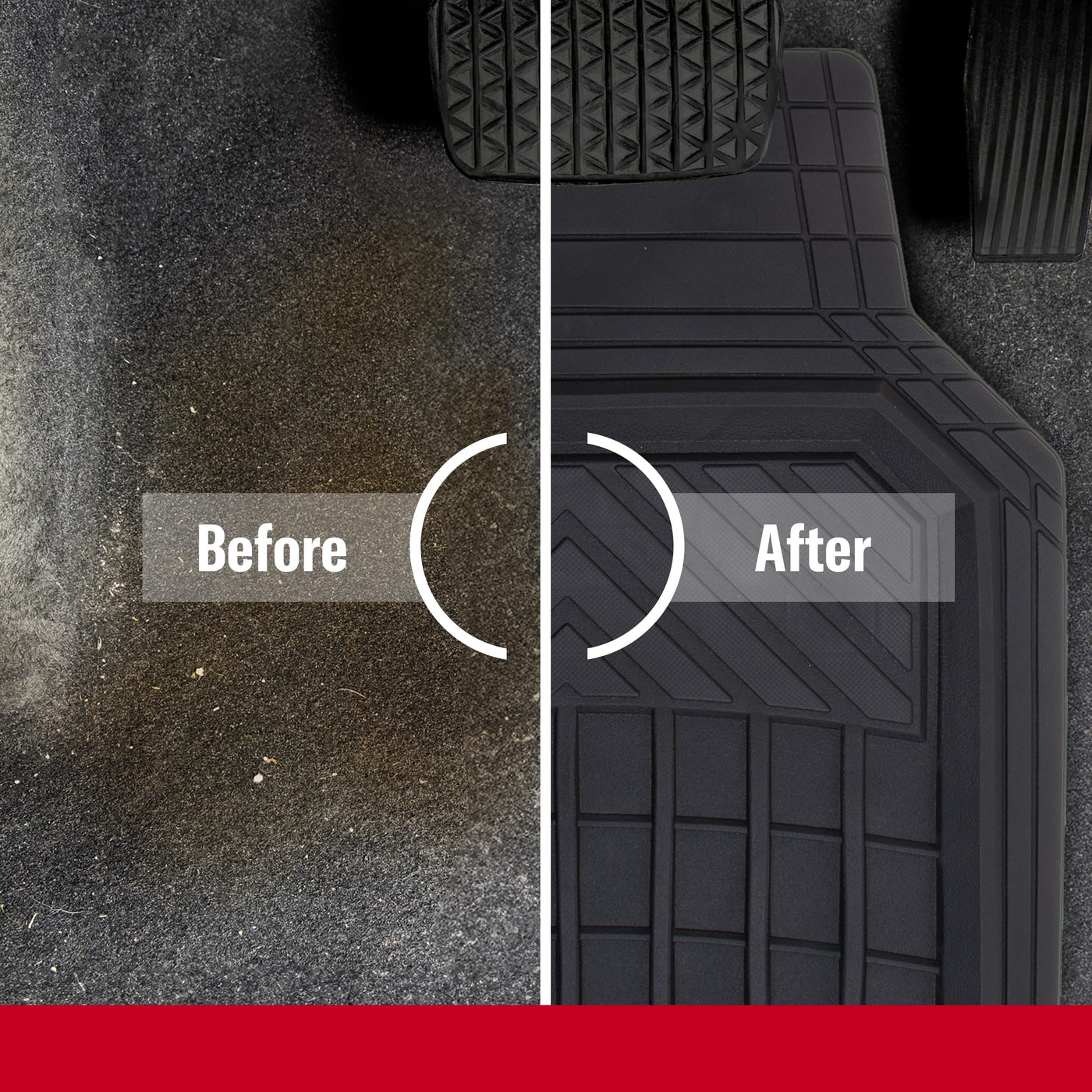 Give your vehicle the protection it deserves from a brand you can trust with these Dickies 4-Piece Black Deep-Tray Floor Mats. Ideal for any season, these heavy-duty mats are manufactured to protect your vehicles floors from the elements. A deep-tray traps dirt, road salt, mud, sand, and more, while grooved channels draw water and grime away from your feet. Constructed from a durable polymer material, they not only stand up to wear and tear but will also stand the test of time. The design incorporates a reinforced heel pad that strengthens coverage in high-traffic areas to extend the life of your floor mats. Our specially engineered anti-slip backing makes driving safer by preventing sliding or shifting when you take to the road. Made for use in most cars, trucks, SUVs, and minivans, they can be quickly cut with a pair of scissors to provide a more custom fit. These mats can be installed in minutes and washing them is a breeze with simple soap and water. With the Dickies 4-Piece Black Deep-Tray Floor Mats, you'll have the coverage you need year after year.