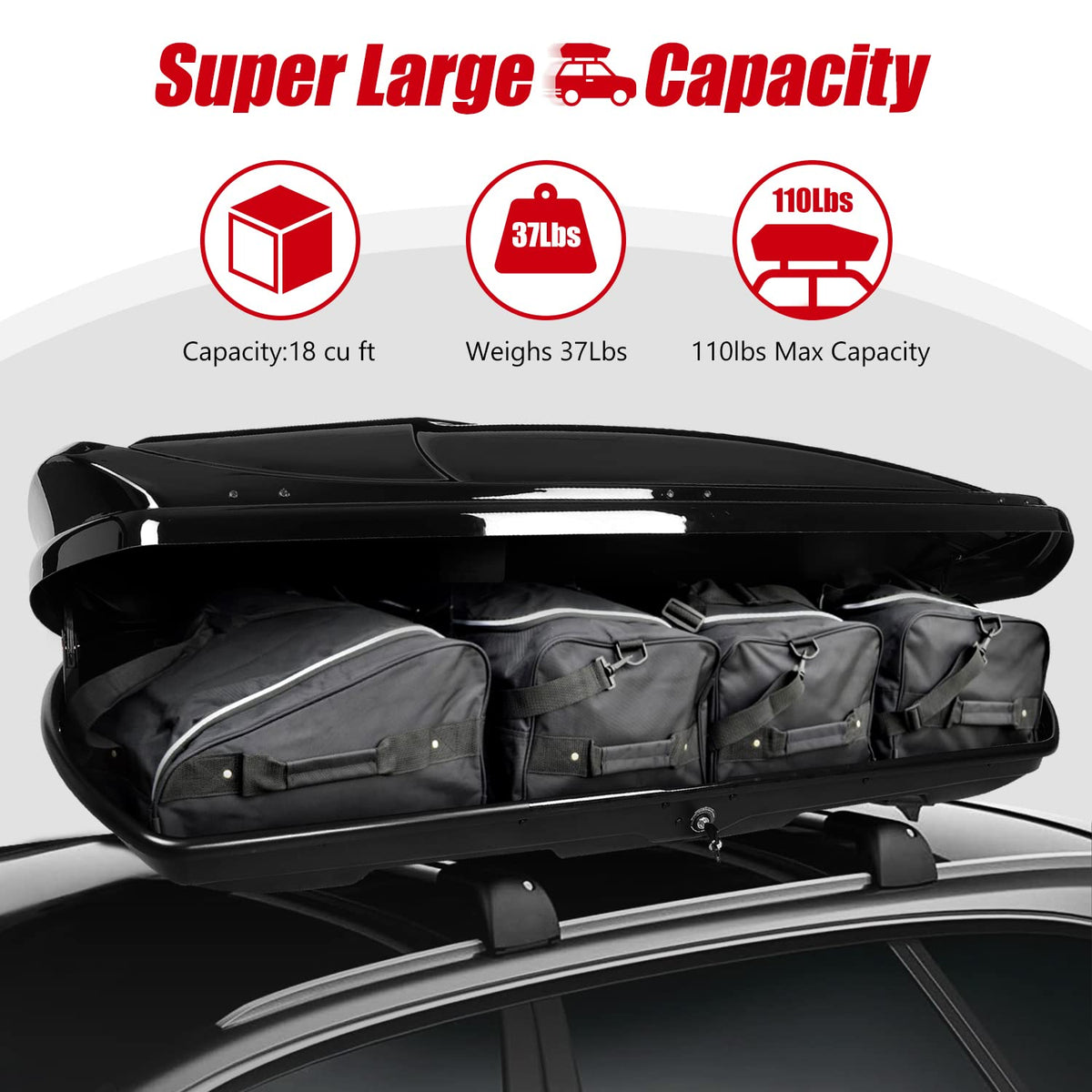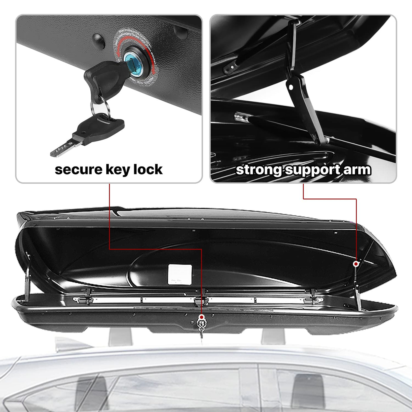 ?UNIVERSAL?This extra long rooftop cargo carrier fits for vehicles with cross bars only, no tool assembly & installation. Increases vehicle cargo space without impeding on passenger comfort. | ?LARGE CAPACITY?Rooftop cargo box provides 15 cubic feet of additional storage space. The maximum storage capacity of 110lbs when evenly distributed. And it can be opened up to 14 wide to store bulky items. | ?ROBUST DESIGN?Constructed of rugged, impact-resistant ABS material for long-lasting durability, able to protect your contents from exposure to the inclement weather. | ?SECURITY LOCKING SYSTEM?Includes key and lock to secure valuables in the box, to ensure cargo safety and s proper lid alignment. It can be opened from either driver or passenger side for easy loading and unloading, that it will stay open until you close it. | ?SPECIFICATION?Size: 15 Cubic Feet Internal Storage, 110lbs Max Capacity | Overall Dimensions: 80 L X 30 W X 13 H | Weighs: 37Lbs | Surface Finish: Black Glossy Smooth Finish