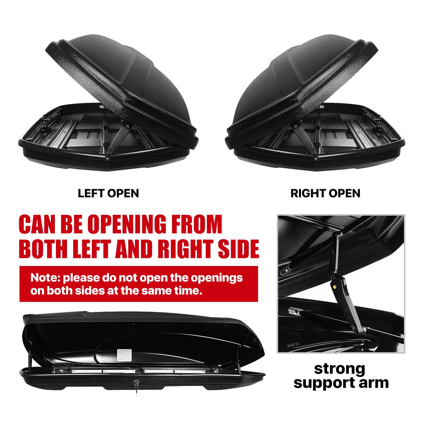 ?UNIVERSAL?This extra long rooftop cargo carrier fits for vehicles with cross bars only, no tool assembly & installation. Increases vehicle cargo space without impeding on passenger comfort. | ?LARGE CAPACITY?Rooftop cargo box provides 15 cubic feet of additional storage space. The maximum storage capacity of 110lbs when evenly distributed. And it can be opened up to 14 wide to store bulky items. | ?ROBUST DESIGN?Constructed of rugged, impact-resistant ABS material for long-lasting durability, able to protect your contents from exposure to the inclement weather. | ?SECURITY LOCKING SYSTEM?Includes key and lock to secure valuables in the box, to ensure cargo safety and s proper lid alignment. It can be opened from either driver or passenger side for easy loading and unloading, that it will stay open until you close it. | ?SPECIFICATION?Size: 15 Cubic Feet Internal Storage, 110lbs Max Capacity | Overall Dimensions: 80 L X 30 W X 13 H | Weighs: 37Lbs | Surface Finish: Black Textured Finish