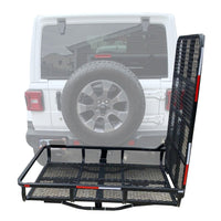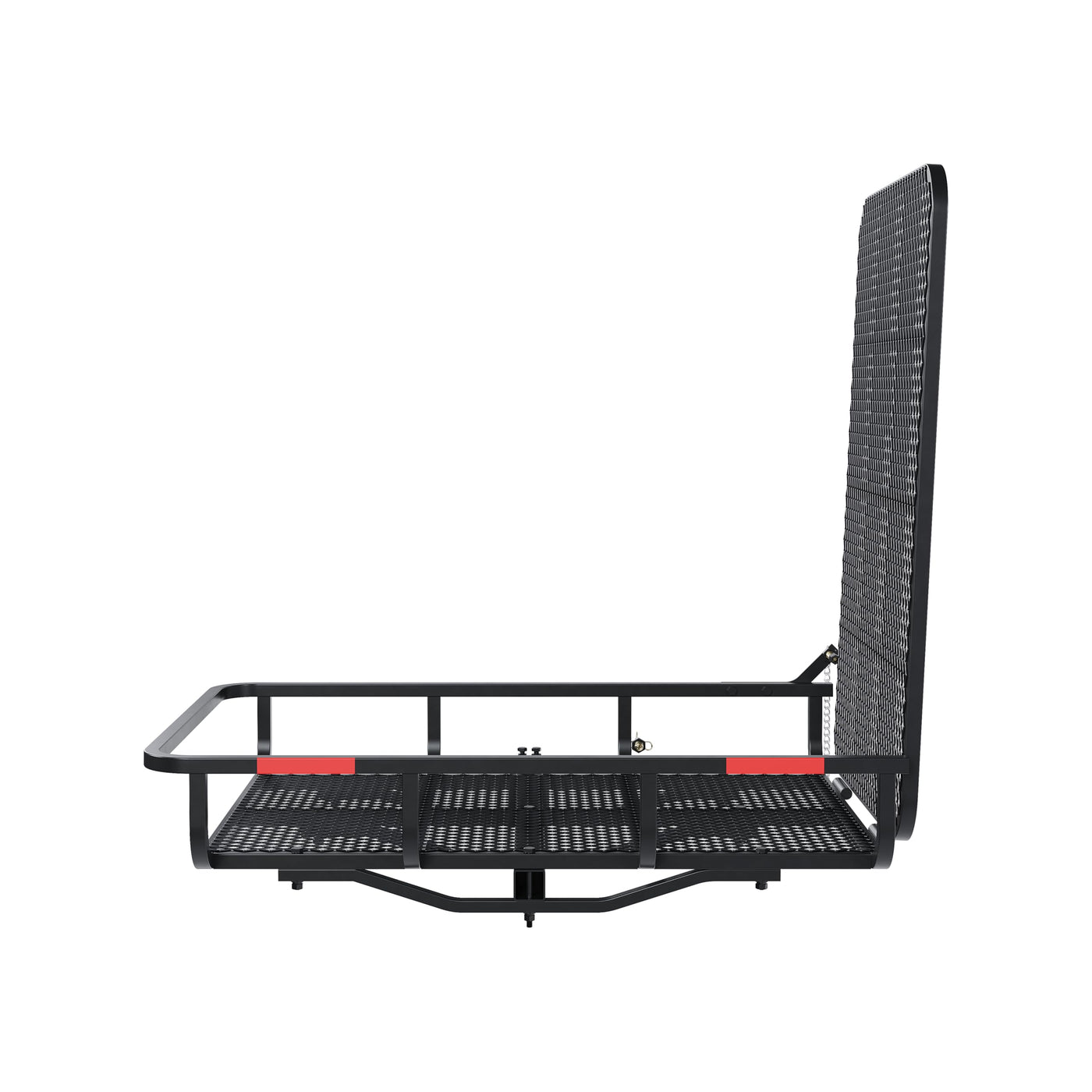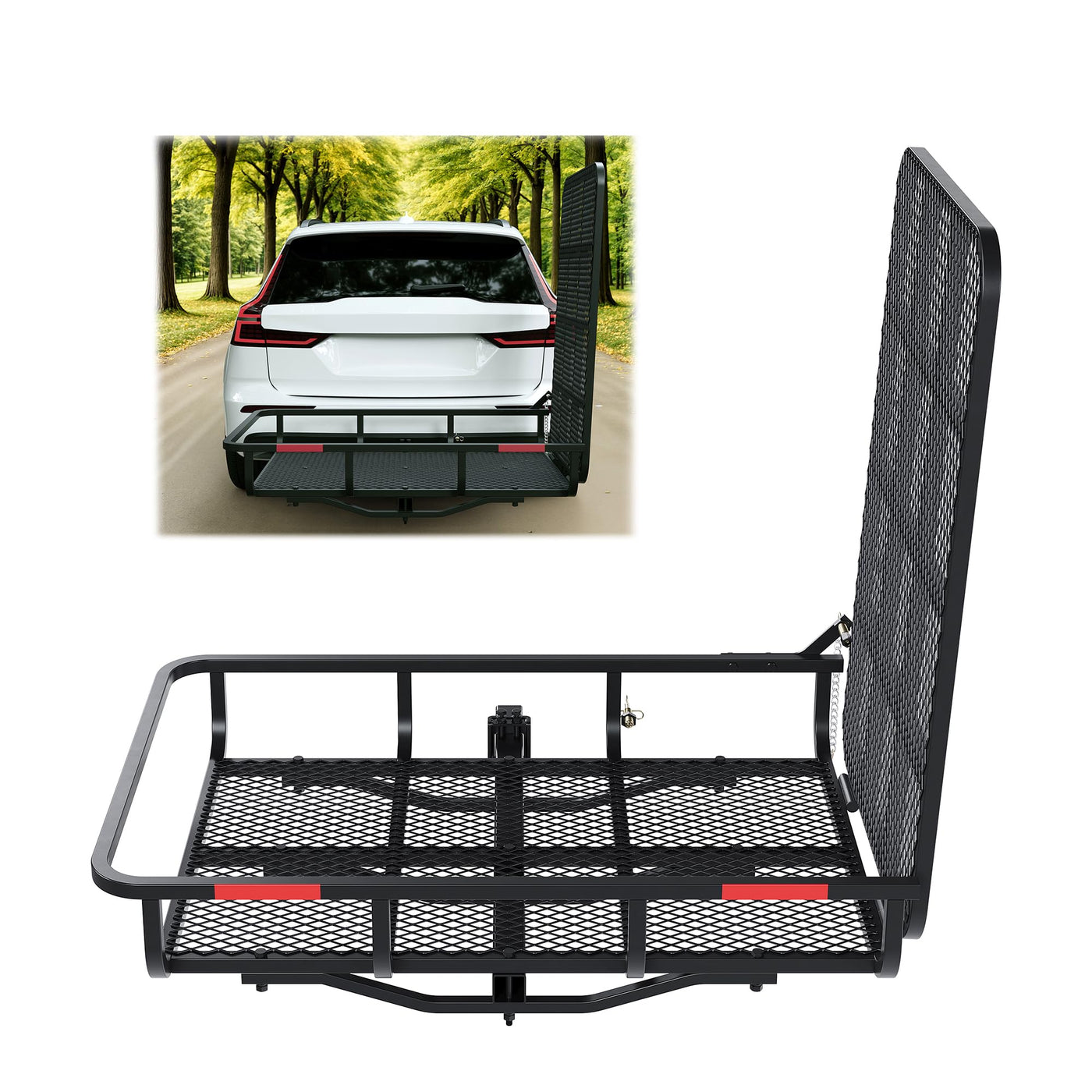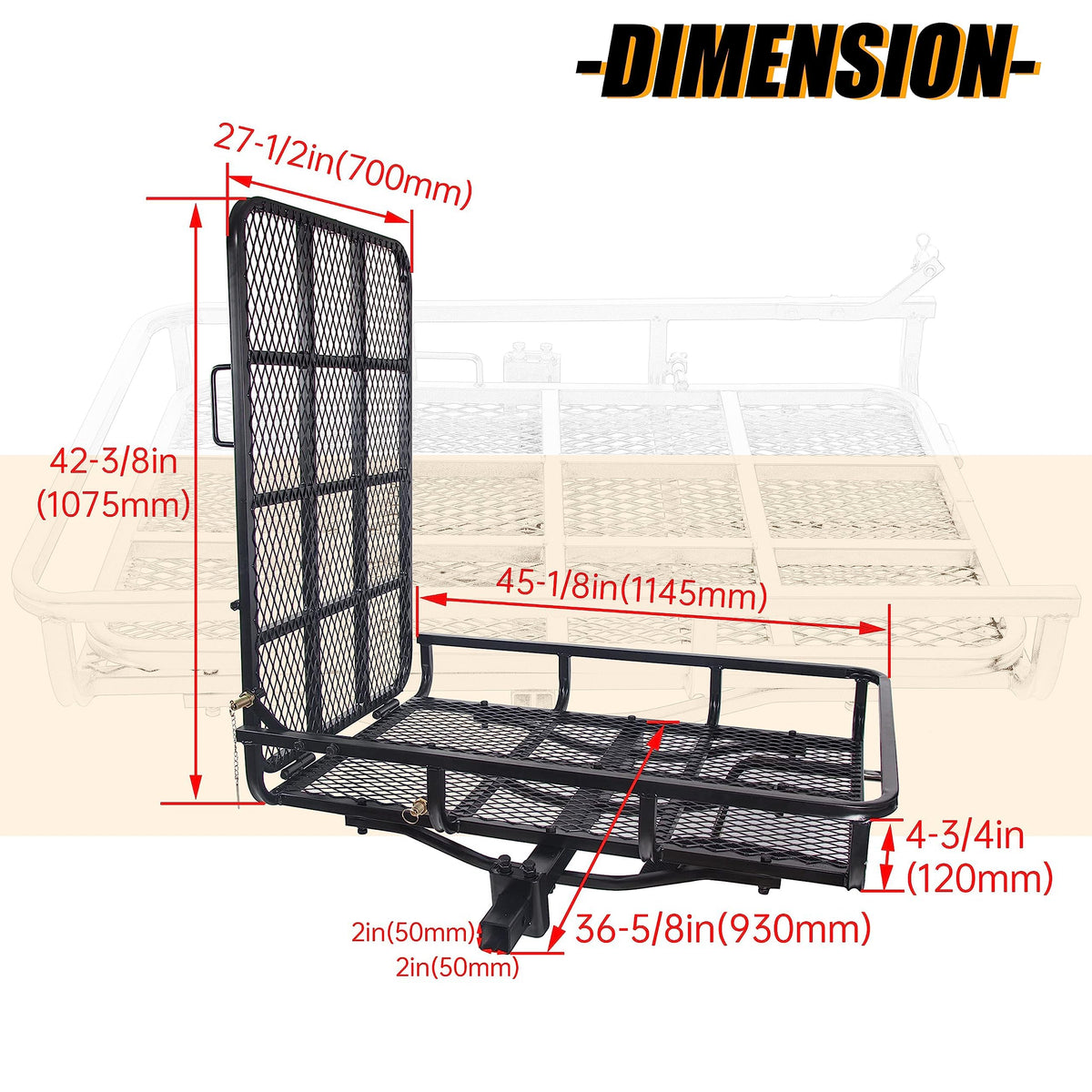 Fitment: This carrier is compatible with trucks, suvs, or vans. Use this basket carrier to tow the cargo to the rear of any vehicle with a class III or IV 2 hitch. | Function: This hitch-mounted and basket-style cargo carrier can be used as a carrier, great to carry wheelchair, scooter, lawn mower,carrying up to 500 lbs. Total weight: 73 Lbs.Widely use for transporation. | Feature: Made of heavy-duty steel construction with pull locks. The durable black powder coated finish will provide the extra protection .Adapt to any environment and not easy to deform. | Condition:11 tie-down points for securing the cargo and the 3 safety rail on it will prevent cargo from falling down when driving at high speed. | Easy to use: Product Dimension: 31-3/4” (W) × 44-3/4” (L) × 6”(H). Inside Bed Dimensions: 29-3/4 (W) x 43-3/4 (L) x 5 (H). Ramp Dimensions: 29-3/4 (W) x 42-1/2 (L).Handle on the ramp for easy folding and unfolding.