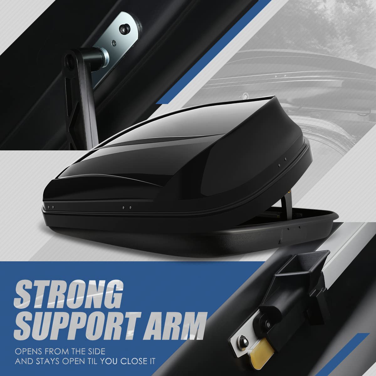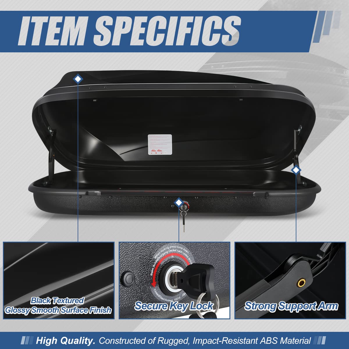 Q: What materials are used in the construction of this cargo box?A: This roof cargo box is constructed from rugged and impact-resistant ABS plastic, ensuring durability and longevity even in challenging outdoor conditions.