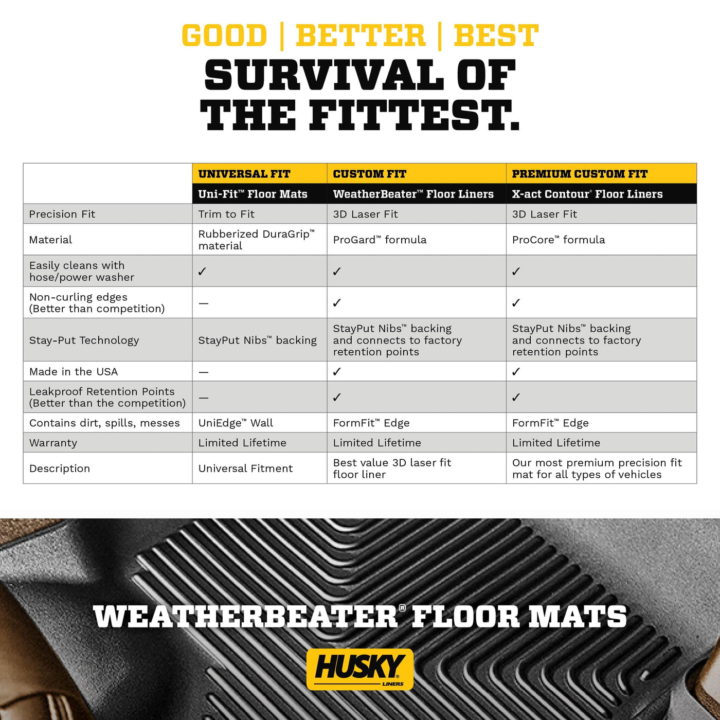 LASER-TIGHT FIT MEETS PROVEN DURABILITY | The Weatherbeater combines a patented laser-tight fit with the proven durability that built the Husky reputation. It’s protection for life, warrantied the same. The original all-weather liner is ready, come rain, snow or dropped coffee. The Weatherbeater’s construction is a no-slip zone with zero edge curl, and its StayPut Nibs keep it firmly anchored underfoot. It stands up to the adventures of everyday life while staying tough and flexible, even under extreme temperatures. Its laser-scanned, FormFit Design gives your truck, van, or SUV an ultra-clean look with easy cleanup to match, while its patented, FormFit Edge keeps spills contained and carpets unstained. It’s unbeatable Husky protection for life, warrantied the same. Proudly made in the USA.