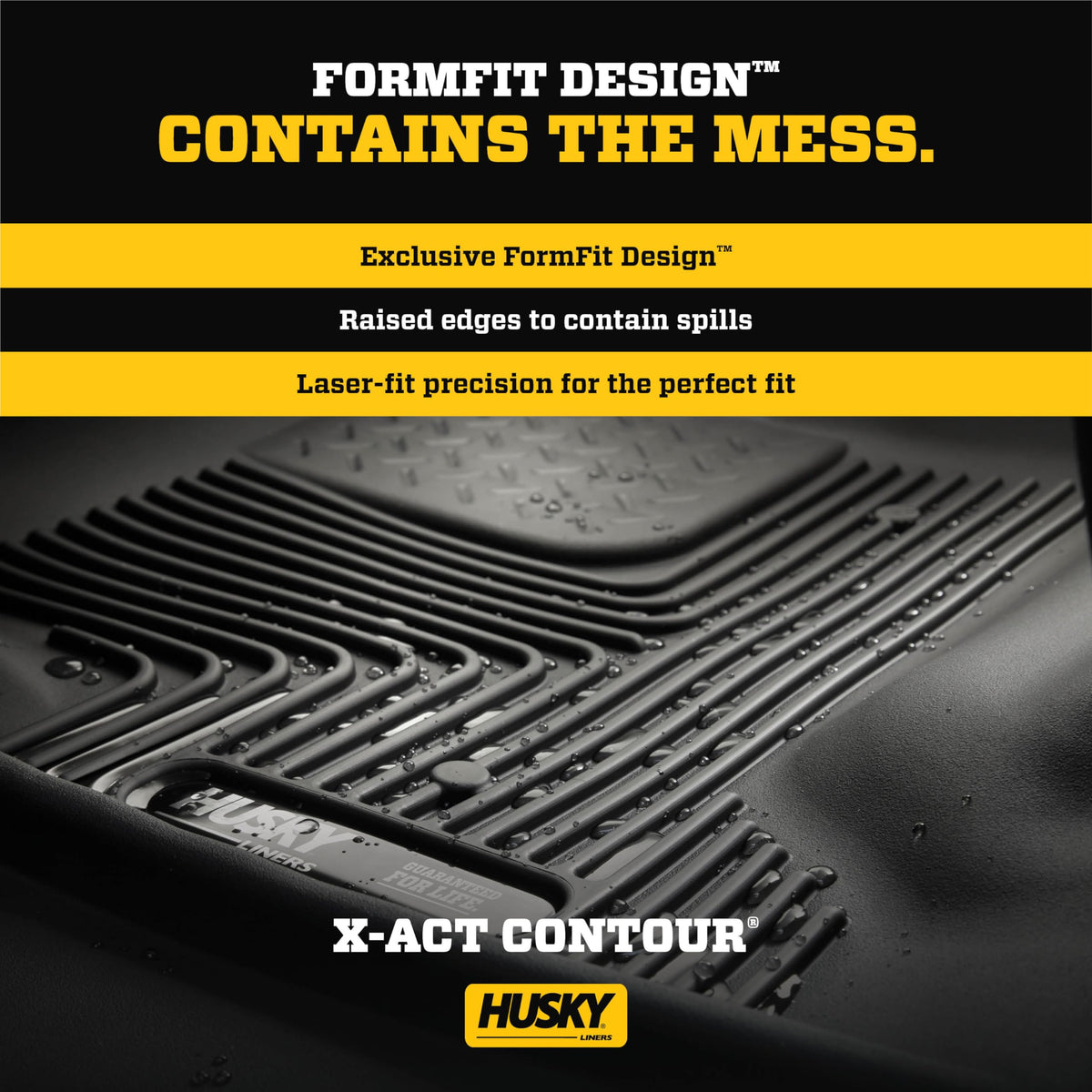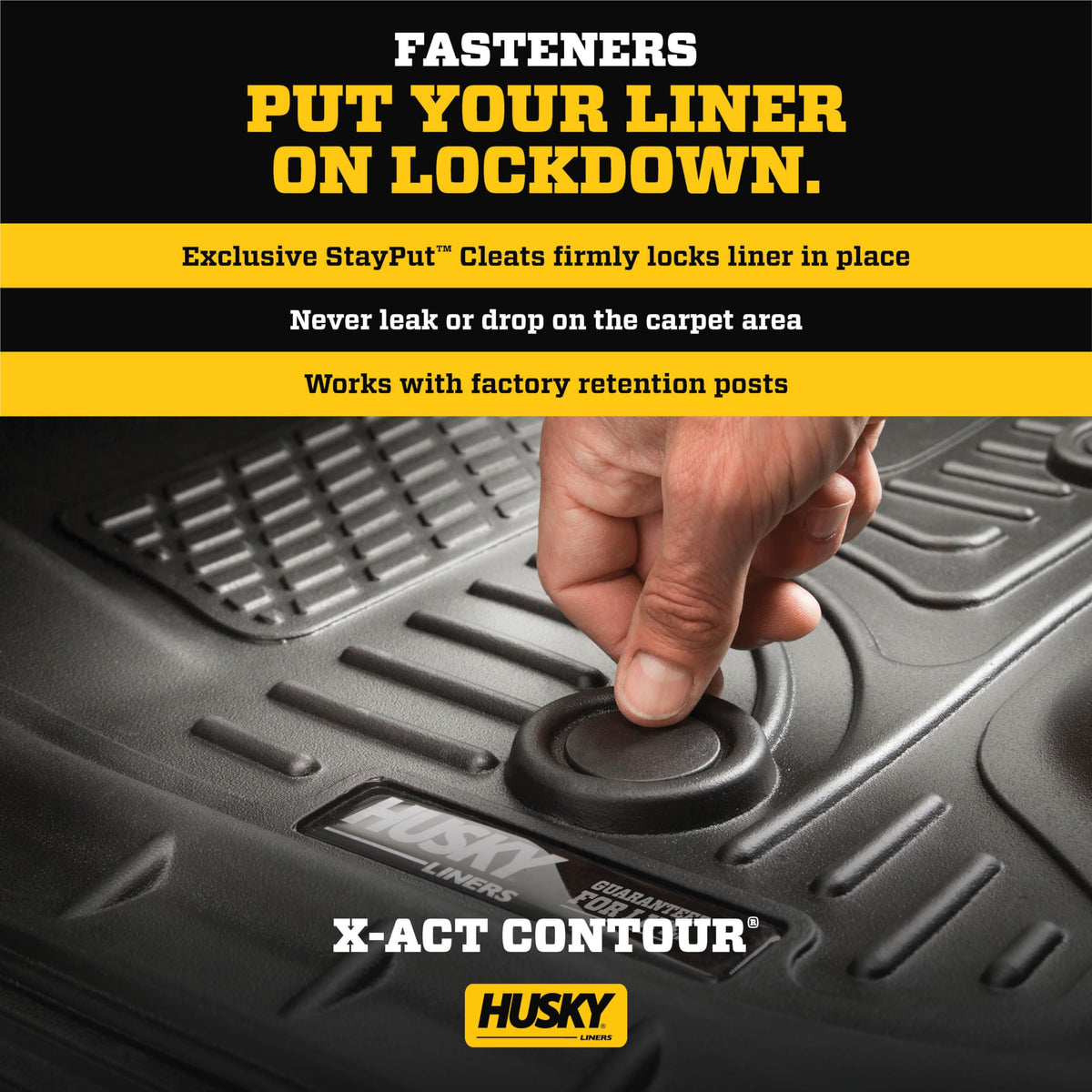 Survival Of The Fittest Starts With The Best Fit. Husky X-Act Contour Liners Combine Laserscanned, Exact Fit With A No-Slip, Duragrip Surface And A Softer Feel. Its The Highest Evolution Of The Same Grit-Tough Durability Thats Gone Into The Husky Brand Since 1988. Built For Abuse That Would Curl The Edges Of Lesser Liners. It Locks To Your Vehicles Factory Retention Posts, With The Added Stability Of Our Stay-Put Nibs For A No-Slip, No-Slide, Surface With Absolutely Zero Compromise In Protection. Theyre Made To Stand Up To Whatever Youre Laying Down- Including Chemicals Like Battery Acid And Oil, With Our Formfit Edge To Keep Spills Contained For Easy Cleanup. Just Remove, Spray, And Theyre Back On The Job. Available In Black. Built To Last A Lifetime, Warrantied The Same. Right Here In Winfield, Kansas, America.