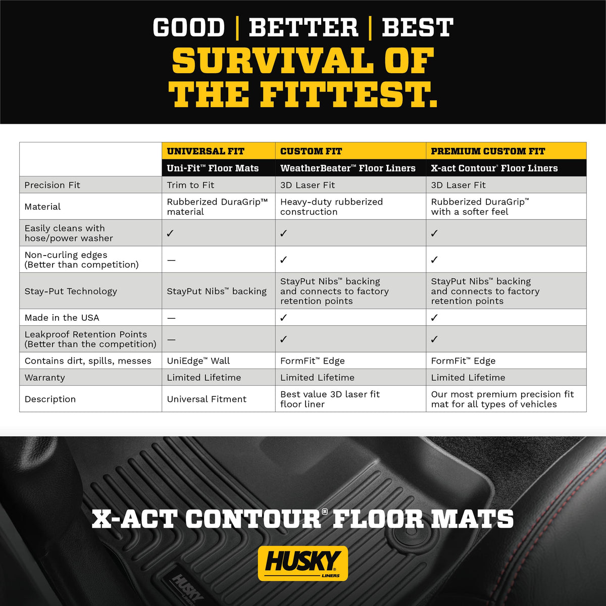 Survival of the fittest starts with the best fit. Husky X-act Contour liners combine laserscanned, exact fit with a no-slip, DuraGrip surface and a softer feel. It’s the highest evolution of the same grit-tough durability that’s gone into the Husky brand since 1988. Built for abuse that would curl the edges of lesser liners. It locks to your vehicle’s factory retention posts, with the added stability of our Stay-Put Nibs for a no-slip, no-slide, surface with absolutely zero compromise in protection. They’re made to stand up to whatever you’re laying down— including chemicals like battery acid and oil, with our FormFit Edge to keep spills contained for easy cleanup. Just remove, spray, and they’re back on the job. Available in black. Built to last a lifetime, warrantied the same. Proudly Made in the USA.