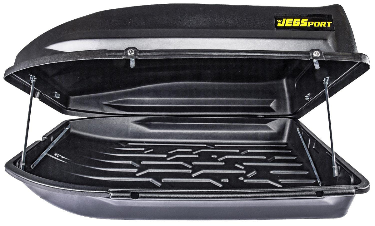 18 Cubic Ft. Secure & protect your gear in this 18 cubic ft. hdpe plastic hard shell car top cargo carrier; high-capacity interior dimensions 57 l x 38 1/2 w x 17 3/4 h inches; aerodynamic design for fuel efficiency Weatherproof storage for your luggage with a four corner locking system, front latch, and weather-tight seal for ultimate car rooftop protection and security Easy & convenient loading and unloading from either side of the car make for smooth travel and hassle-free storage No tools required, easy assembly and installation. all mounting hardware and simple instructions are included to get you safely on the road quickly Made in usa, limited lifetime guarantee. the jegs rooftop cargo carriers high-quality construction and performance give you peace of mind Notes: Designed to fit ONLY on cross rail systems rated at 150 lbs. and greater. This cargo carrier must be mounted onto a roof rack with horizontal crossbars. JEGS 90098 Rooftop Cargo Carrier Features 110 lb. Carrying Capacity Overall Dimensions: 57 in. L x 38 1/2 in. W x 17 3/4 in. H Integrated hinges for dual side opening Four corner locking system & front latch for ultimate security Manufactured with durable, 4-season HDPE black plastic Fits round, square, and aero bar designs up to 4 in. wide. Pre-drilled cross-rail mounting holes are 24 in. on center. Be sure to allow for clearance of rear hatchback, roof-mounted antennas, and navigation fins. Replacement Keys & Locks Available