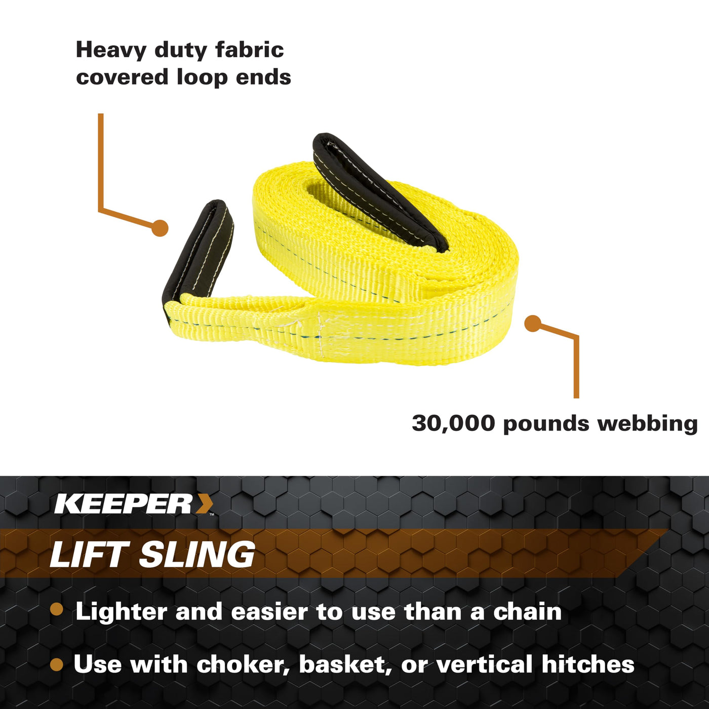 Keeper's 16' x 3'' Lift Sling features 2 PLY, type 3, class 7 lift sling with 30,000 pounds webbing (9,800 pounds webbing per inch width minimum. Lighter and easier to use than a chain and manufactured per WSTDA standards. These well engineered products are the most trusted to provide unique, simple solutions for specific everyday needs, offering reliability, security, safety, and ease of use.