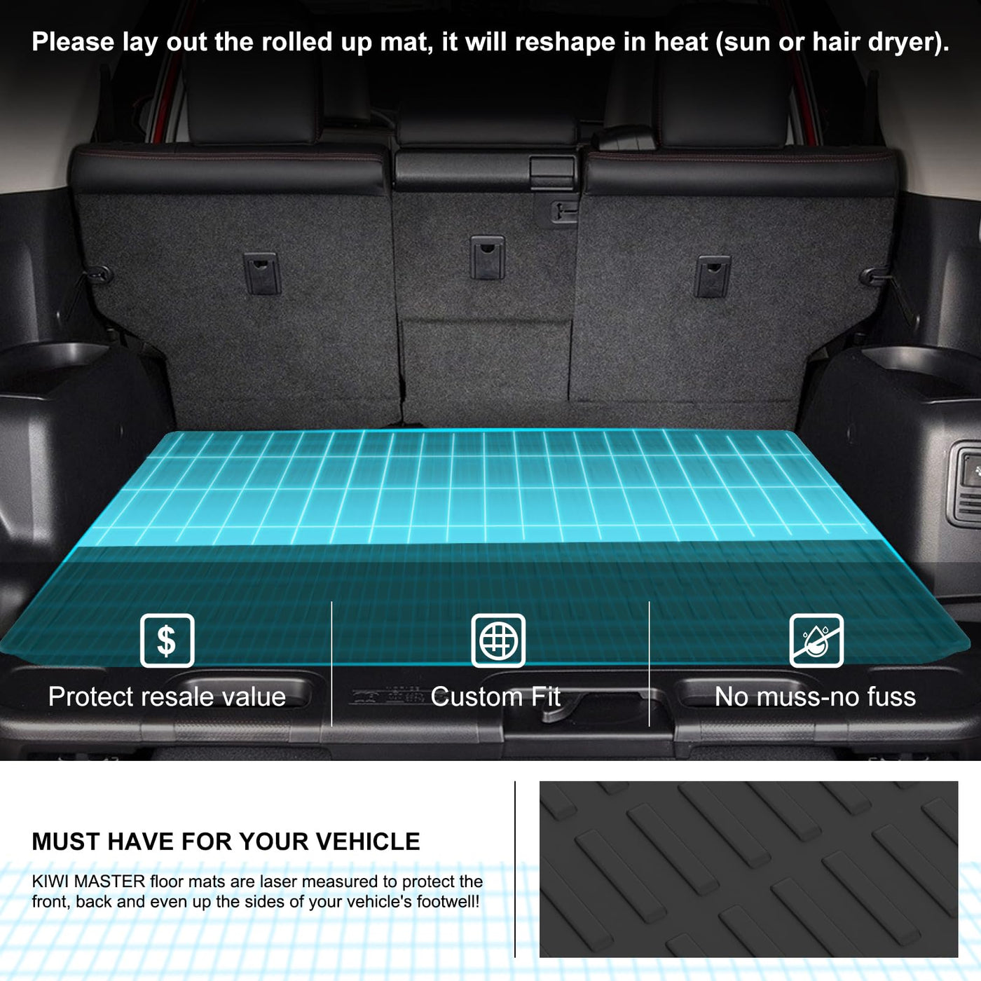 KIWI MASTER 4Runner floor mats protect the vehicle's driver and passenger floors. Made of TPE material, these mats will hold up to the harsh elements, preventing stains and moisture to the original factory carpets. Easily clean mats with soap and hot or cold water and a mild brush, no harsh scrubbing or special cleaners needed special anti-skid nib backing will prevent any slipping or movement on contact. Keep your focus on your driving, and not on adjusting your car mats keep your car floor in pristine condition, easily, from the trusted brand in automotive car accessories. Specification: Color:Black Material:TPE Shipping Weight: 9.0 LBS Packing Dimension: 38.1 x 5.7 x 5.7 inches Fitment: Compatible for 2010-2024 4Runner Without 3rd Row Seat Package Included: 1 Cargo mat for 2010-2024 4Runner Without 3rd Row Seat