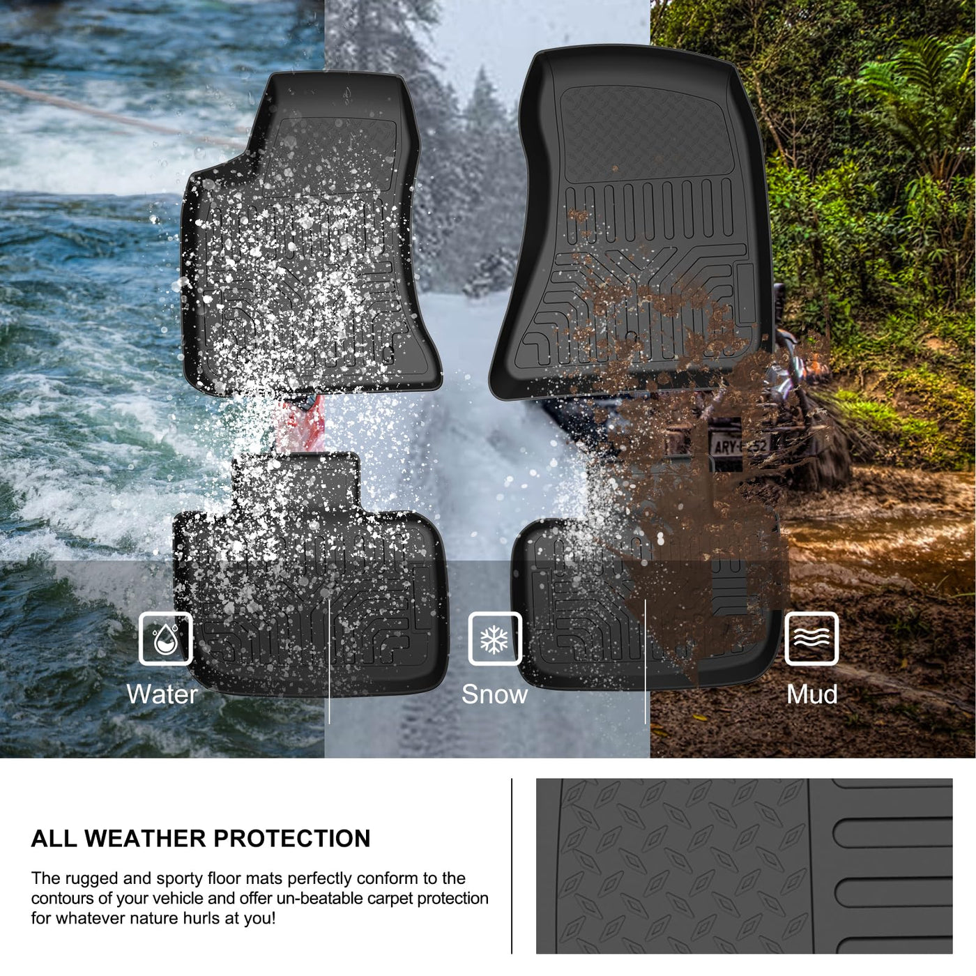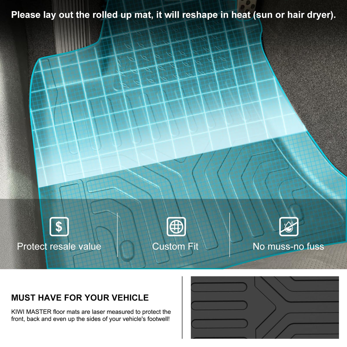 Q: Do these floor mats provide all-weather protection?A: Yes, the KIWI MASTER floor mats are designed for all-weather protection, effectively shielding your vehicle's interior from dirt, mud, snow, and spills, making them ideal for any climate.