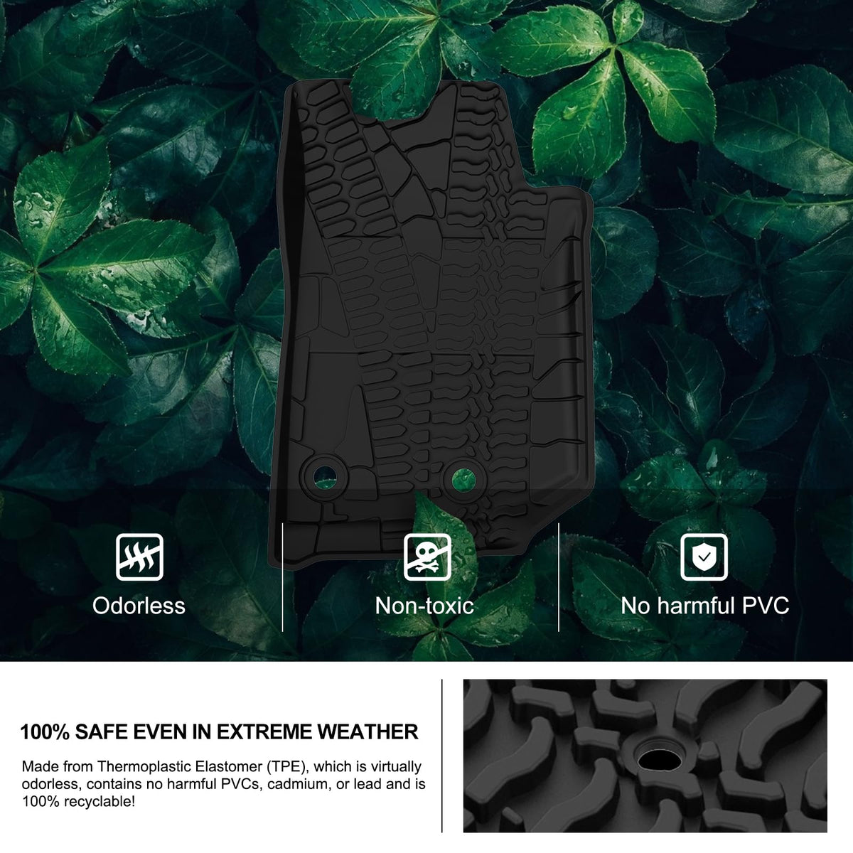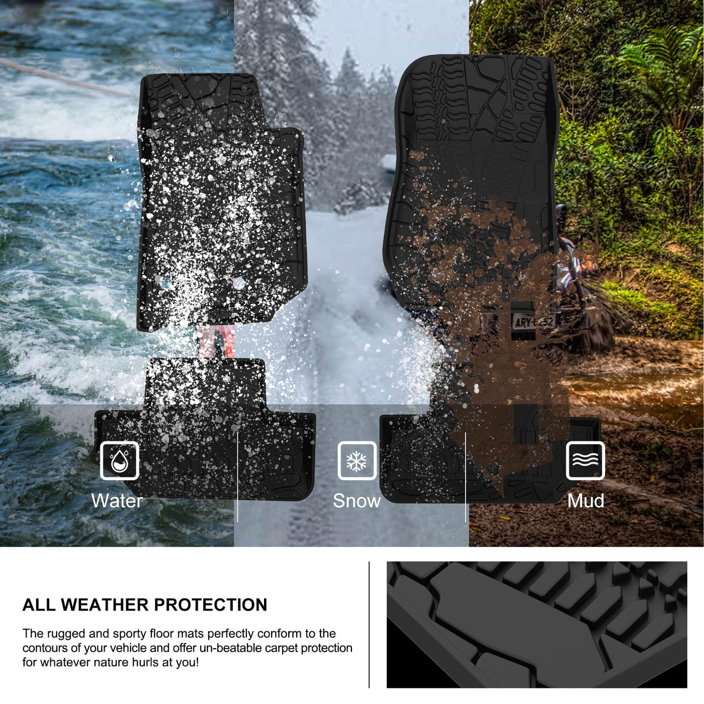 KIWI MASTER Wrangler JK floor mats protect the vehicle's driver and passenger floors. Made of TPE material, these mats will hold up to the harsh elements, preventing stains and moisture to the original factory carpets. Easily clean mats with soap and hot or cold water and a mild brush, no harsh scrubbing or special cleaners needed special anti-skid nib backing will prevent any slipping or movement on contact. Keep your focus on your driving, and not on adjusting your car mats keep your car floor in pristine condition, easily, from the trusted brand in automotive car accessories. Specification: Color:Black Material:TPE Shipping Weight: 5.7 LBS Packing Dimension: 26.0 X 19.9 X 3.5 inches Fitment: 2014 2015 2016 2017 Wrangler JK Package Included: 1Set of Floor Mats for 2014-2017 Wrangler JK 2-Door