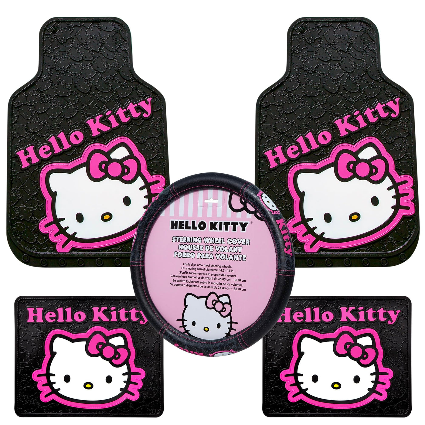 Plasticolors 5-piece kit of Hello Kitty classic Collage designed Floor Mats and matching Steering Wheel Cover are perfect for any Hello Kitty fan. All products in this kit are Officially licensed by Sanrio. This Listing is for One (1) Set of Floor Mats (total 4pcs - 2 Front and 2 Rear Mats) and matching Design Steering Wheel Cover. These items are all universal fit sized, designed to fit MOST vehicles. Individual fit will depend on the vehicles exact Make, Model and Year. Plasticolors design adds customized style to any vehicle while protecting the vehicle's original interior. Made of durable, easy to clean materials with high quality graphics, giving a bold and stylish look thats sure to make your vehicle stand out on the road. Due to being packaged compactly, please lay flat in the warm sun for a while before installation, the mats will gradually flatten out.