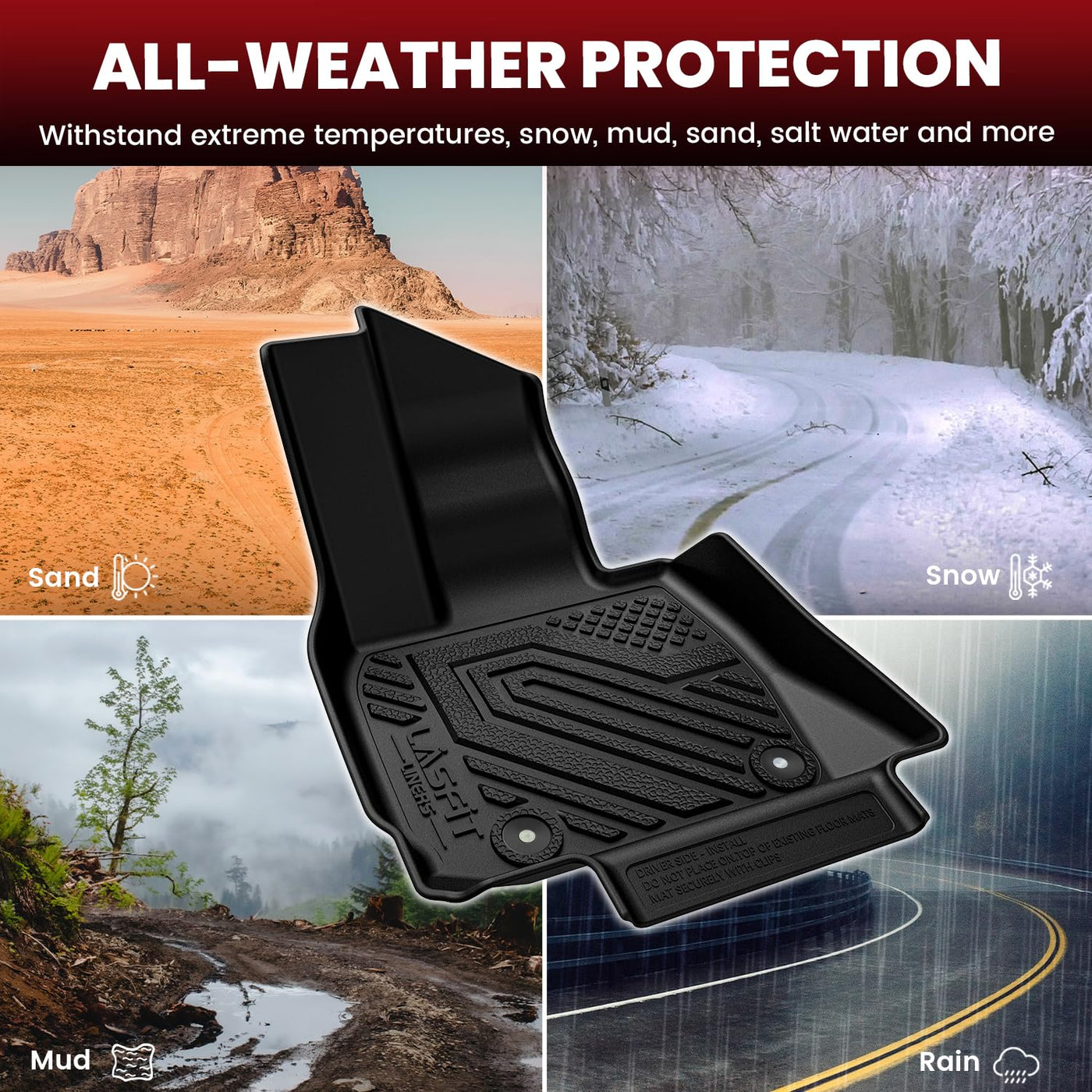 The LASFIT floor mats and trunk mat for the BMW X3 2025 are precisely designed using advanced 3D laser scanning technology to ensure a perfect custom fit with full coverage. Made from 100% TPE material through high-precision injection molding, they offer a soft yet durable texture that is skid-proof, recyclable, and resistant to wear. The raised edges and deep grooves effectively trap dirt, liquids, and debris, preventing spills from reaching your vehicles carpet. Built for all-weather protection, these mats shield your interior from mud, rain, snow, and extreme temperatures while the anti-slip studs and secure buckles enhance driving safety. Installation is effortless, snapping securely into place with the original clips for a firm hold. The foldable material allows for easy handling, while cleaning requires only a quick rinse or wipe, making maintenance hassle-free. Designed for durability and convenience, these mats maintain their shape and provide long-lasting protection. Backed by a 45-day return policy and 24/7 customer support with local store assistance in California, LASFIT floor mats and trunk liners deliver premium coverage and peace of mind for your BMW X3 2025.