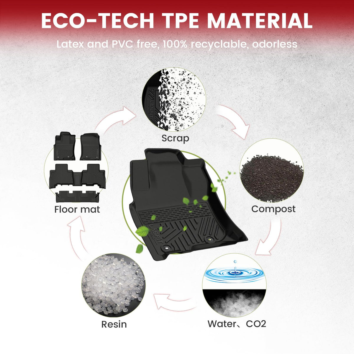 This automotive floor mats is custom fit for Toyota 4Runner 2013-2024, Front Row + 2nd Row TPE floor liners. The Car floor mats are suitable for people who like outdoor activities. Outdoor scenes: climbing, hiking, camping, hunting, fishing, surfing, skiing etc.The only thing you will get is the safe & custom fit 4runner floor mats for limited/sr5/sr5 premium/trail/trd/trd off-road/trd off-road premium/trd pro/trd sport/venture/nightshade 4 runner mats. It's good for containing mess from wet or dirty shoes, whatever you step in. Reasons to choose LASFIT Floor Mats: The edge of the floor mat adopts a reinforced design, so that the floor mat fits the contour of the original car carpet more. Remain flexible in extreme weather and is not easily break, deformed, deteriorated or hardened. Easy to install and disassemble, the whole process only takes a few seconds. All seasons and weather full protection. Keep your carpet clean. Easy to Clean and Maintain, Soft and Flex Tough. Safety, Give you the most comfortable feeling.