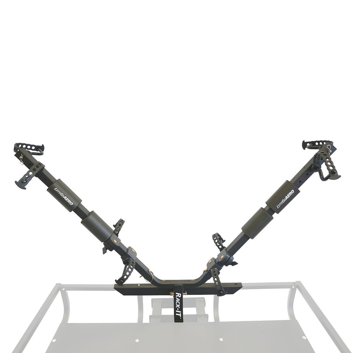 Let's Go Aero bring a fresh perspective to travel and gear management as it combines its award-winning GearCage mount and the state-of-the-art design of the Vme's wheel-touch only bicycle carriers. No longer must travelers choose between packing extra underwear or bring their favorite Bike along. Built on the GearCage platform, the Rack-IT 2-Bike Accessory Rack is designed for carrying two bikes of any size and frame above the GearCage cargo carrier, leaving the rack unobstructed use of the cargo rack's capacity for cargo gear. Using Vme's Zero-G technology, the Rack-IT grips the bicycles at opposite points on each tire allowing the carrier to motionlessly transport bicycles ranging from the smallest kids bikes to the largest mountain bikes. Weighing only 17lbs, the Rack-IT leaves lots of room for all new Bike, Board, & Bag accessories including the BikeBag 2-Bike Cover with LED lights, the 9 c.f. AerBag Storage System, and the Fat Bike Cradles for even the widest of tires.