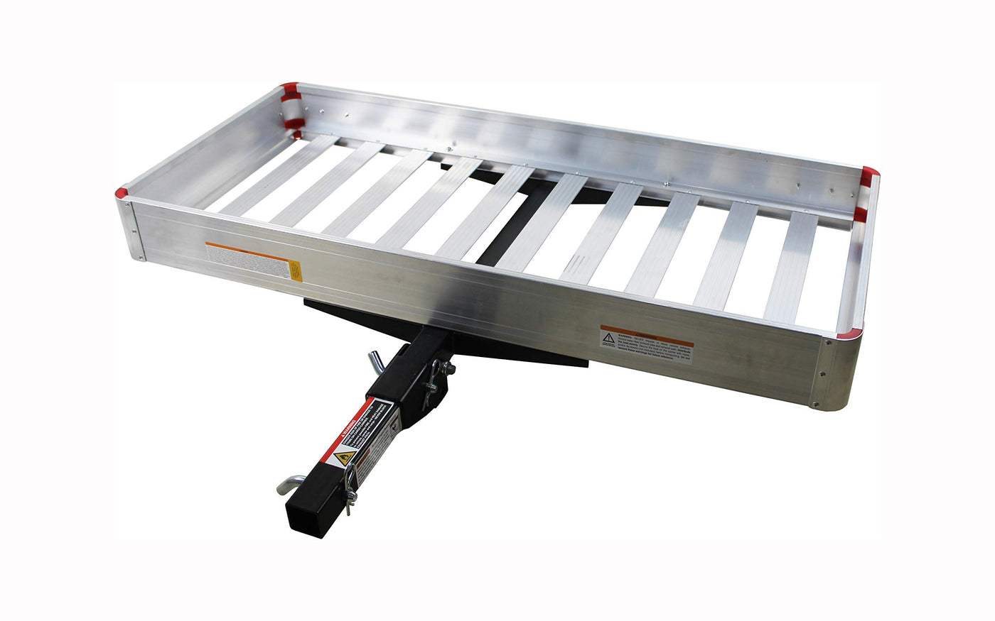 Our MaxxHaul 50 x 22 Premium Folding Aluminum Cargo Carrier is constructed from extruded aluminum material that is durable and lightweight and easy-to-install. Unit will come with the basket already asssembled and just need to attach the heavy duty steel frame under support with a 2 x 2 hitch shaft to fit standard Class III and IV hitch receivers. Whether you are going camping, going to a long road trip, or picking up someone at the airport or simply transporting a load that you don’t want to put inside your car or don't have enough space, this cargo carrier is just the right solution to provide instant cargo space. Raised side rails help keep cargo in place and provide multiple-tie down or anchor point options.