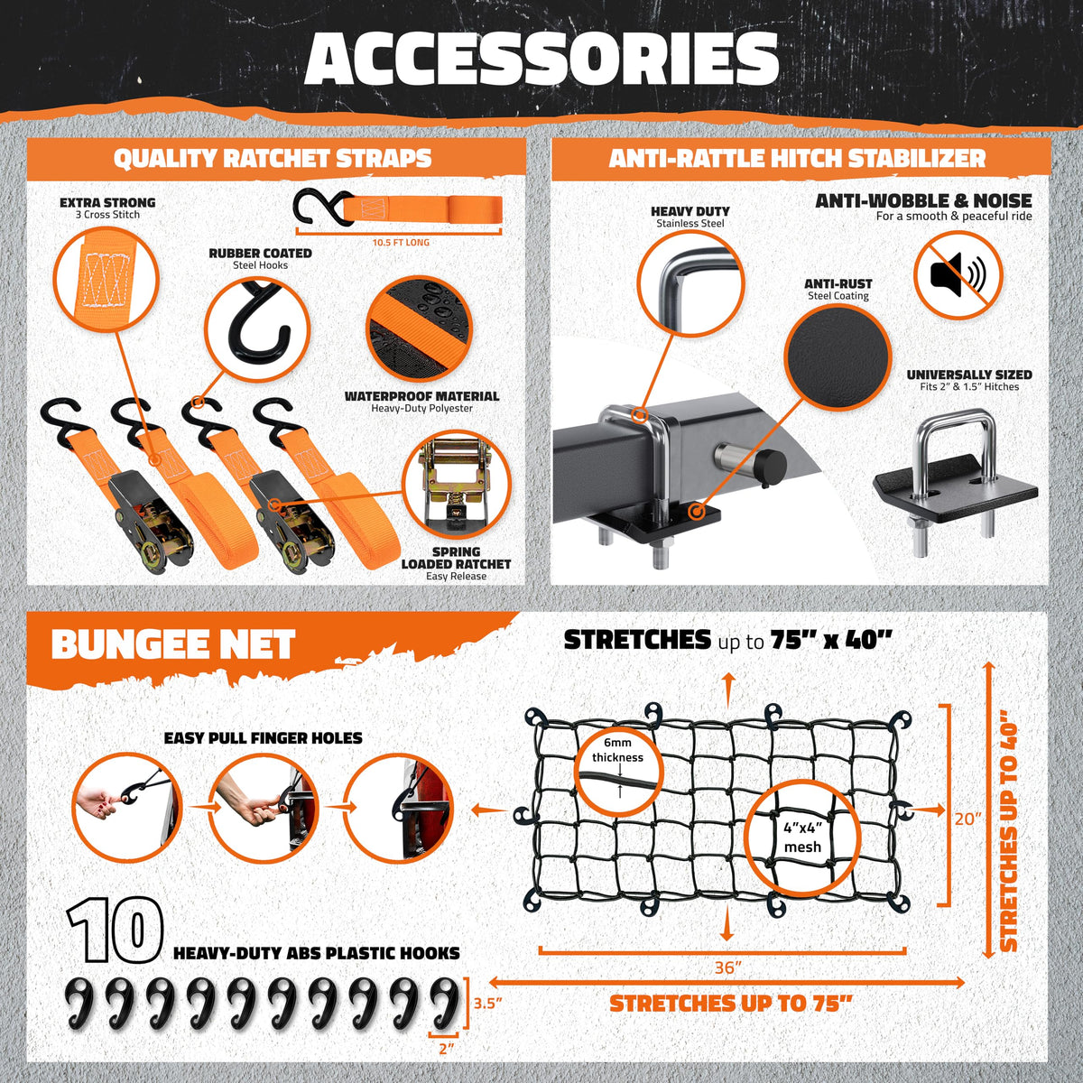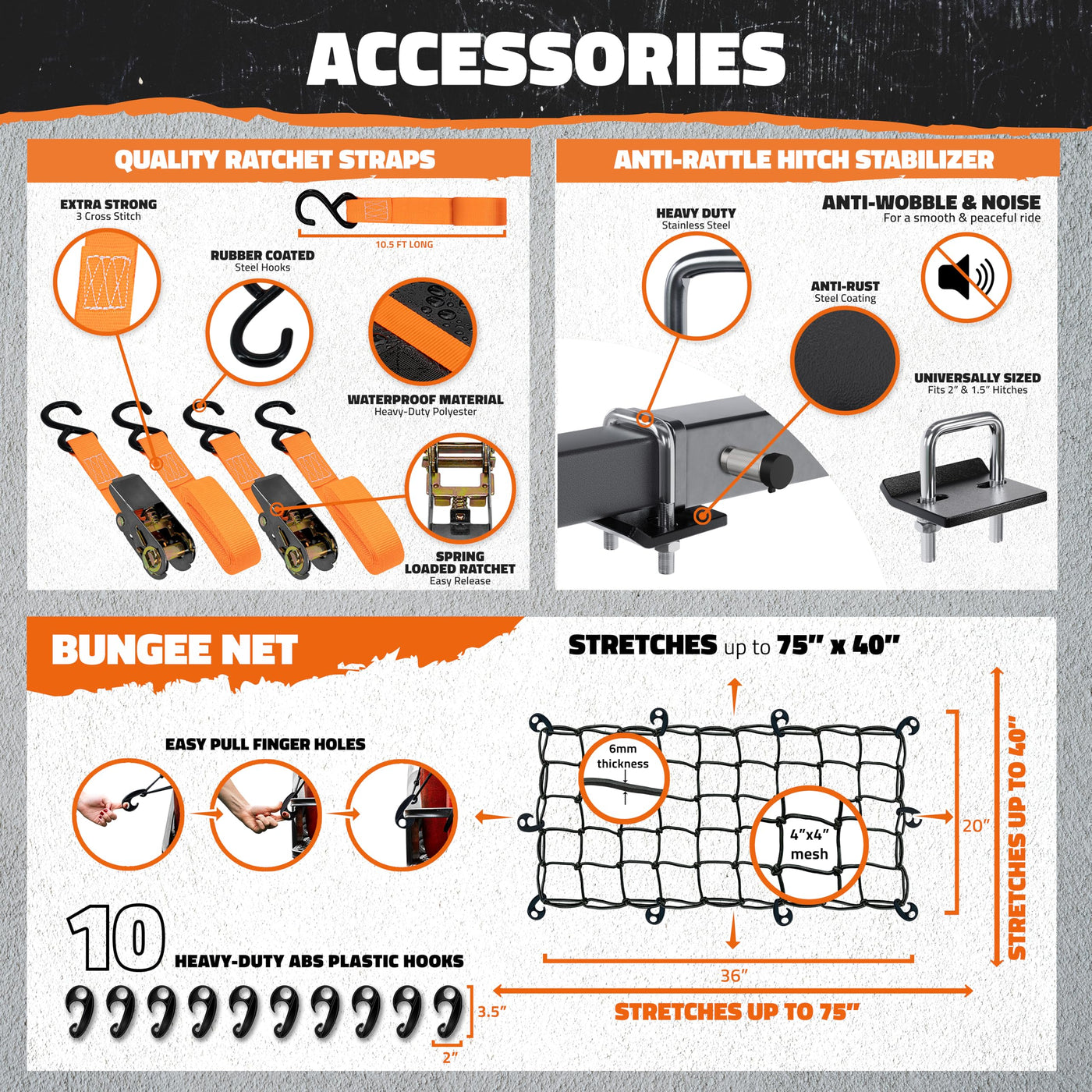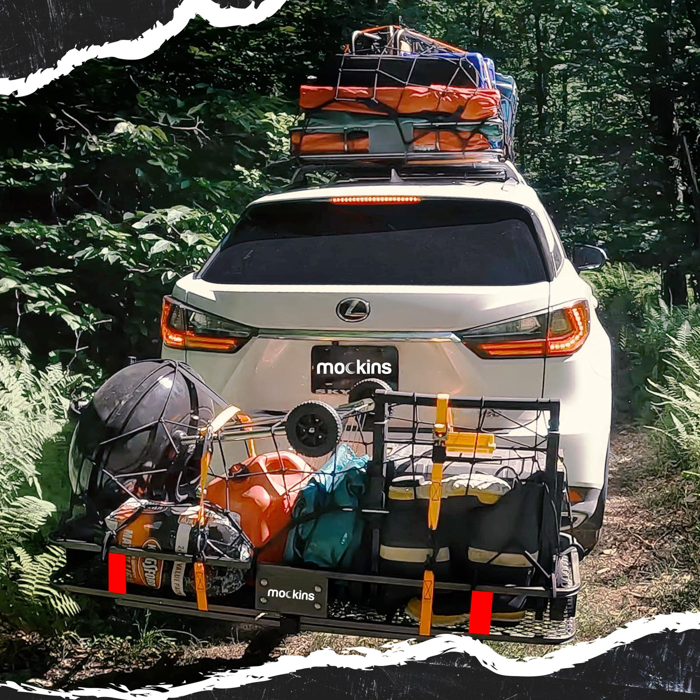 Built to carry loads of up to 500 lbs. with ease, this trailer hitch cargo carrier is crafted from durable, weather-resistant steel. It offers a reliable solution for transporting everything from camping gear to heavy construction materials. With a spacious frame of 60''L x 20''W x 6''H, this cargo hitch carrier is suitable for SUVs, cars, and trucks, providing ample room for all your gear. Engineered for versatility and safety, this trailer hitch rack fits securely with any 2'' hitch receivers. The 6'' high side rails keep your cargo contained, and the bright reflectors enhance visibility, so you'll have a safe journey wherever you go. The Mockins Cargo Racks for Trailer Hitch are also fully equipped with essential accessories, including ratchet straps, a cargo net, a hitch stabilizer and a hitch lock set. Whether you're driving an SUV, car, or truck, this hitch carrier is designed to meet all your hauling needs. Whats Inside the Package: 1 x Folding Luggage Rack for SUV and Car 2 x Ratchet Straps 1 x Cargo Net 1 x Hitch Stabilizer 1 x Hitch Lock with 2 Keys Backed by a 10-year warranty, Mockins Vehicle Cargo Carriers provide peace of mind and reliability on every trip. Travel with confidence, knowing your belongings are secure and ready for the road ahead.