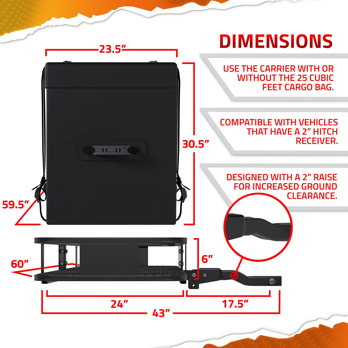 - Hitch mount cargo carrier. - All hardware included such as nuts and bolts and reflectors - minor assembly required (tools not included) - 25 cubic foot abrasion resistant heavy duty vinyl waterproof cargo bag with side handles - Storage bag for your cargo bag, making it easy to store mess free -Cargo net to help secure your things during transit. - 6 Buckle Straps - 2 Ratchet Straps -Bag lock - Hitch Lock to lock your carrier and prevent theft - Hitch stabilizer to reduce noise and wobble