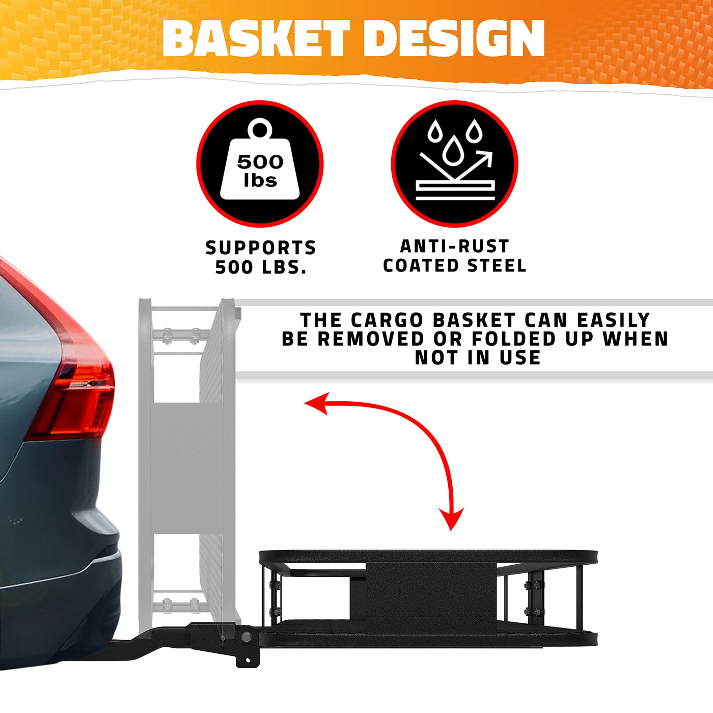 - Free up more space for your family and friends. - Keep wet and dirty items from getting your vehicle muddy and messy. - Sturdy steel construction with a corrosion-resistant black powder coat finish. - Simple & easy bolt-together assembly. - Mesh floor is easy to clean. - 2' Angled arm elevates platform for better ground clearance & less fumes and exhaust hitting your stuff. - Folding design allows carrier to be tilted up alongside the rear of your vehicle when it's not in use.