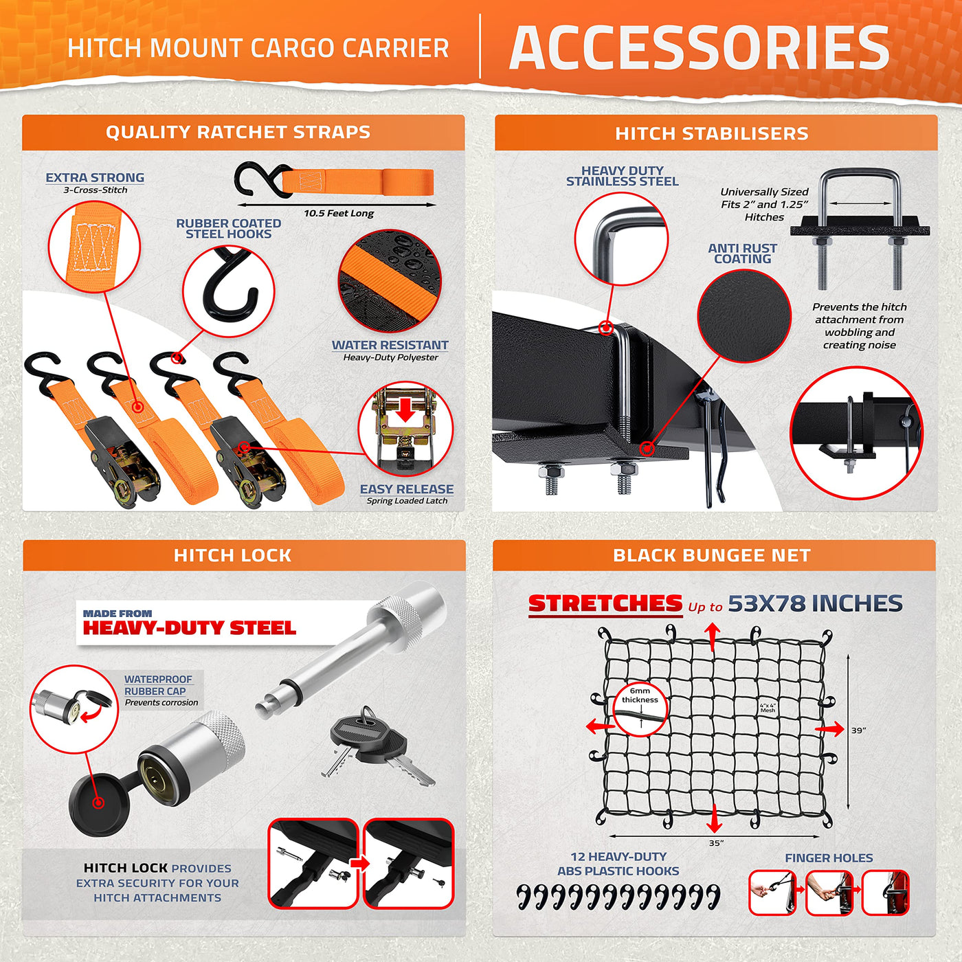 Q: What features help secure my cargo during transport?A: This cargo carrier comes with various features for securing your items, including a cargo net, 6 buckle straps, and 2 ratchet straps. Additionally, a hitch lock is included to prevent theft and ensure your carrier stays securely attached to your vehicle.