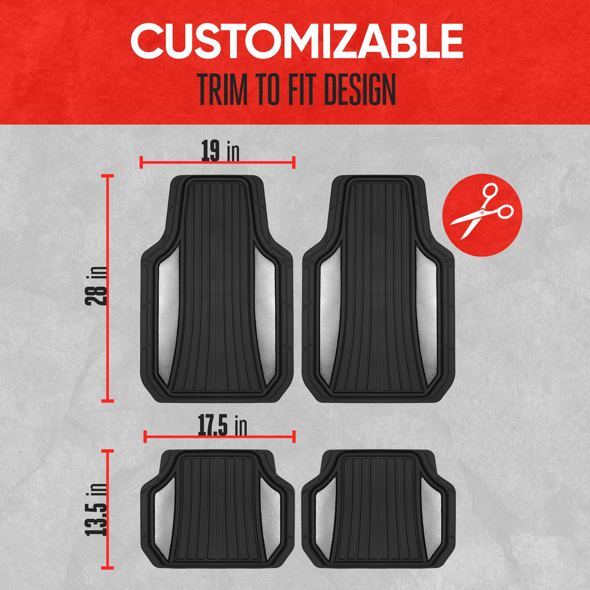 Enhanced Interior Protection: These durable car floor mats from Motor Trend provide superior protection against dirt, spills, and wear, preserving your vehicle's interior. Two-Tone Design: Featuring a stylish black and silver color combination, these mats not only protect but also add a touch of elegance to your car's interior. Premium Quality: Crafted from high-quality rubber, these mats are built to last, withstanding daily use and extreme conditions without cracking or deforming.