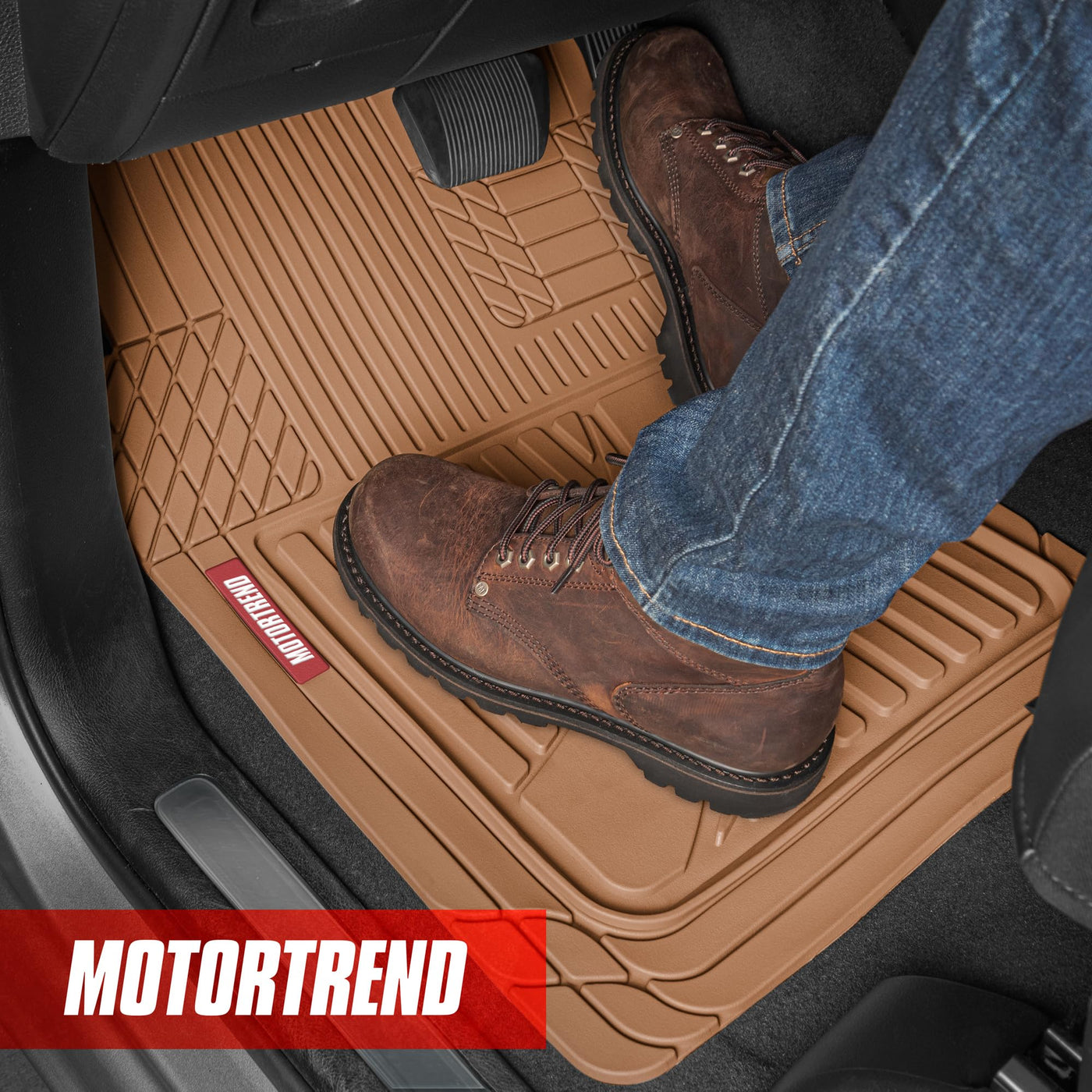 Motor Trend FlexTough Advanced Heavy Duty Black Rubber Car Floor Mats:With decades of experience, you can trust in Motor-Trend's all-weather car mats to offer exceptional reliability, providing year-round protection for your vehicles floors. Made from durable, heavy duty, deep dish, high-quality materials, these mats are designed to withstand heavy use, trapping dirt, water, and debris to keep your car's interior clean and protected all season in any weather. Motor Trend Automotive offers the ultimate protection for your vehicles interior, making it an essential addition to your collection of car accessories for men and women. Whether you drive a car, SUV, or mini-van these rubber mats for floor are the ideal choice to keep your car interior looking pristine.The advanced all weather car floor mats design stand up to snow, rain, mud, and more, making them a reliable choice for protecting your car carpet and preserving the appearance of your vehicle's floors. The tough, slip-resistant surface ensures that debris stays trapped, while the high-quality rubber construction provides a firm grip, keeping the mats securely in place. These mats offer exceptional interior car accessories that are both practical and stylish. These mats are the perfect solution for keeping your vehicle clean and protected.A few examples of SUV or Car make and models these floor mats will fit include: Ford (Explorer, Ranger, Escape, Expedition, Fusion, Lightning Mustang), Toyota (Tacoma, Rav4, Highlander, Prius, Tundra, Camry, Corolla), Chevrolet Chevy, Dodge (Durango, Journey), Honda (Civic, Accord, CR-V, Pilot, Odyssey, HR-V), Nissan (Sentra, Rogue, Altima, Frontier, Titan), Jeep (Wrangler, Grand-Cherokee), Kia (Forte, Telluride, Sorento) and more!