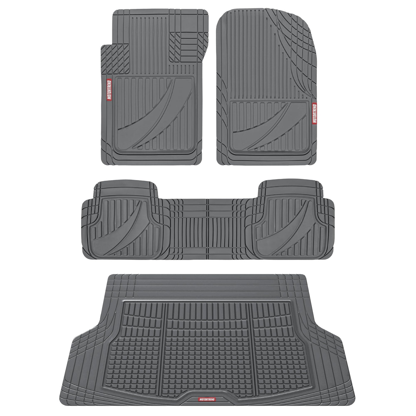 Motor Trend FlexTough Advanced Heavy Duty Black Rubber Car Floor Mats & Cargo Liner:With decades of experience, you can trust in Motor-Trend's all-weather car mats to offer exceptional reliability, providing year-round protection for your vehicles floors. Made from durable, heavy duty, deep dish, high-quality materials, these mats are designed to withstand heavy use, trapping dirt, water, and debris to keep your car's interior clean and protected all season in any weather. Motor Trend Automotive offers the ultimate protection for your vehicles interior, making it an essential addition to your collection of car accessories for men and women. Whether you drive a car, SUV, or mini-van these rubber mats for floor & trunk protection are the ideal choice to keep your car interior looking pristine.The advanced all weather car floor mats design stand up to snow, rain, mud, and more, making them a reliable choice for protecting your car carpet and preserving the appearance of your vehicle's floors. The tough, slip-resistant surface ensures that debris stays trapped, while the high-quality rubber construction provides a firm grip, keeping the mats and trunk liner securely in place. These mats offer exceptional interior car accessories that are both practical and stylish. These mats are the perfect solution for keeping your vehicle clean and protected.A few examples of SUV or Car make and models these floor mats will fit include: Ford (Explorer, Ranger, Escape, Expedition, Fusion, Lightning Mustang), Toyota (Tacoma, Rav4, Highlander, Prius, Tundra, Camry, Corolla), Chevrolet Chevy, Dodge (Durango, Journey), Honda (Civic, Accord, CR-V, Pilot, Odyssey, HR-V), Nissan (Sentra, Rogue, Altima, Frontier, Titan), Jeep (Wrangler, Grand-Cherokee), Kia (Forte, Telluride, Sorento) and more!