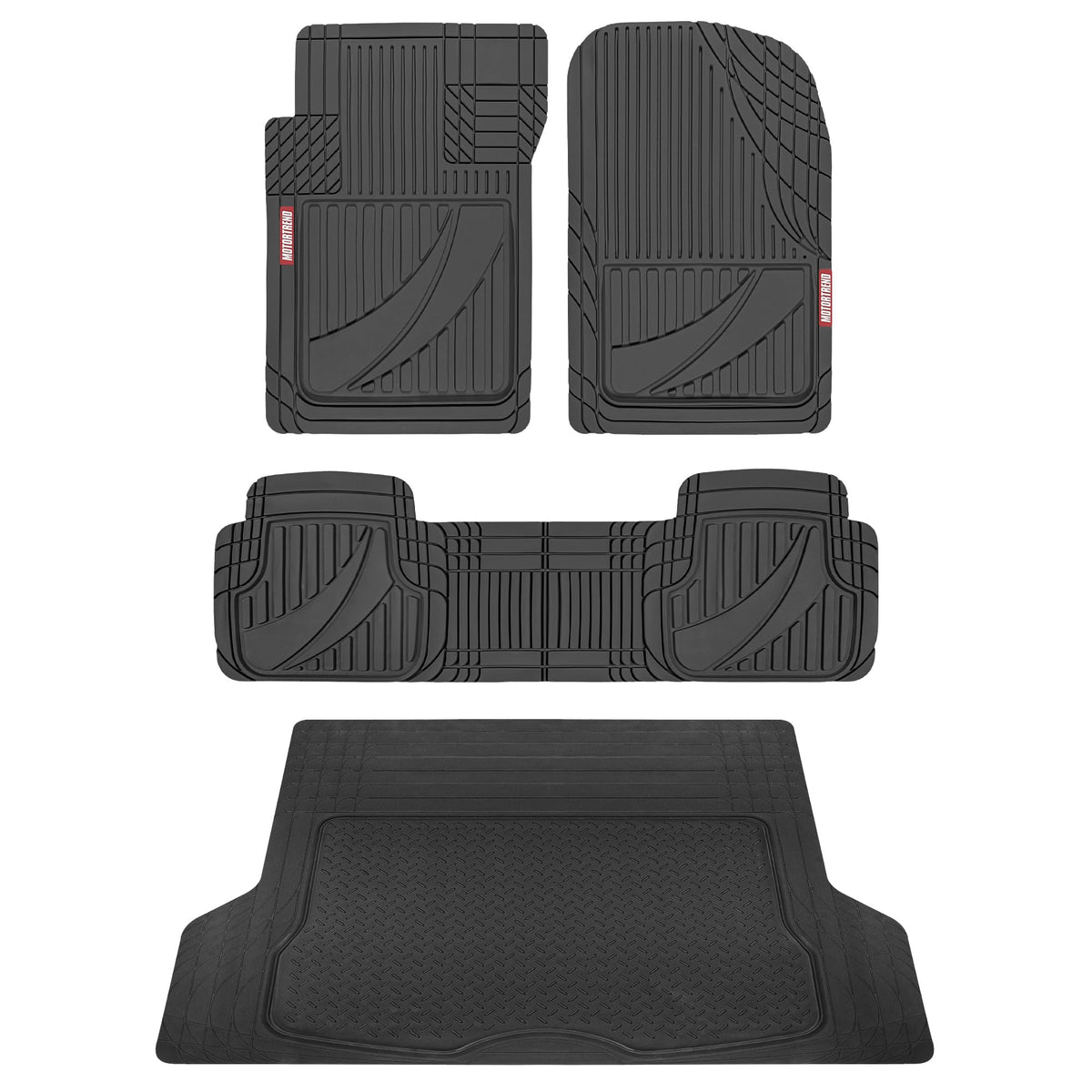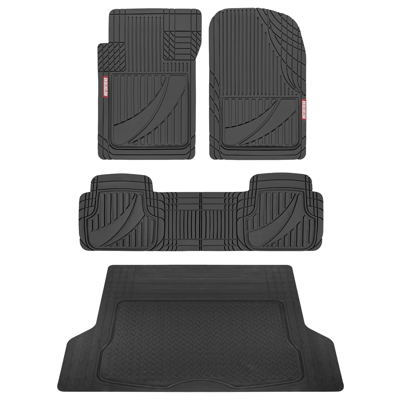 Motor Trend Flex-Tough Advanced Heavy Duty Rubber Car Floor Mats & Cargo Liner:With decades of experience, you can trust in Motor-Trend's all-weather car mats to offer exceptional reliability, providing year-round protection for your vehicles floors. Made from durable, heavy duty, deep dish, high-quality materials, these mats are designed to withstand heavy use, trapping dirt, water, and debris to keep your car's interior clean and protected all season in any weather. Motor Trend Automotive offers the ultimate protection for your vehicles interior, making it an essential addition to your collection of car accessories for men and women. Whether you drive a car, SUV, or mini-van these rubber mats for floor & trunk protection are the ideal choice to keep your car interior looking pristine.The advanced all weather car floor mats design stand up to snow, rain, mud, and more, making them a reliable choice for protecting your car carpet and preserving the appearance of your vehicle's floors. The tough, slip-resistant surface ensures that debris stays trapped, while the high-quality rubber construction provides a firm grip, keeping the mats and trunk liner securely in place. These all weather floor mats offer exceptional interior car accessories that are both practical and stylish. These rubber floor mats are the perfect solution for keeping your vehicle clean and protected.A few examples of SUV or Car make and models these floor mats will fit include: Ford (Explorer, Ranger, Escape, Expedition, Fusion, Lightning Mustang), Toyota (4-Runner, Rav-4, Highlander, Prius, Tundra, Camry, Corolla), Chevrolet Chevy, Dodge (Durango, Journey), Honda (Civic, Accord, CR-V, Pilot, Odyssey, HR-V), Nissan (Sentra, Rogue, Altima, Frontier, Titan), Jeep (Wrangler, Grand-Cherokee), Kia (Forte, Telluride, Sorento) and more!