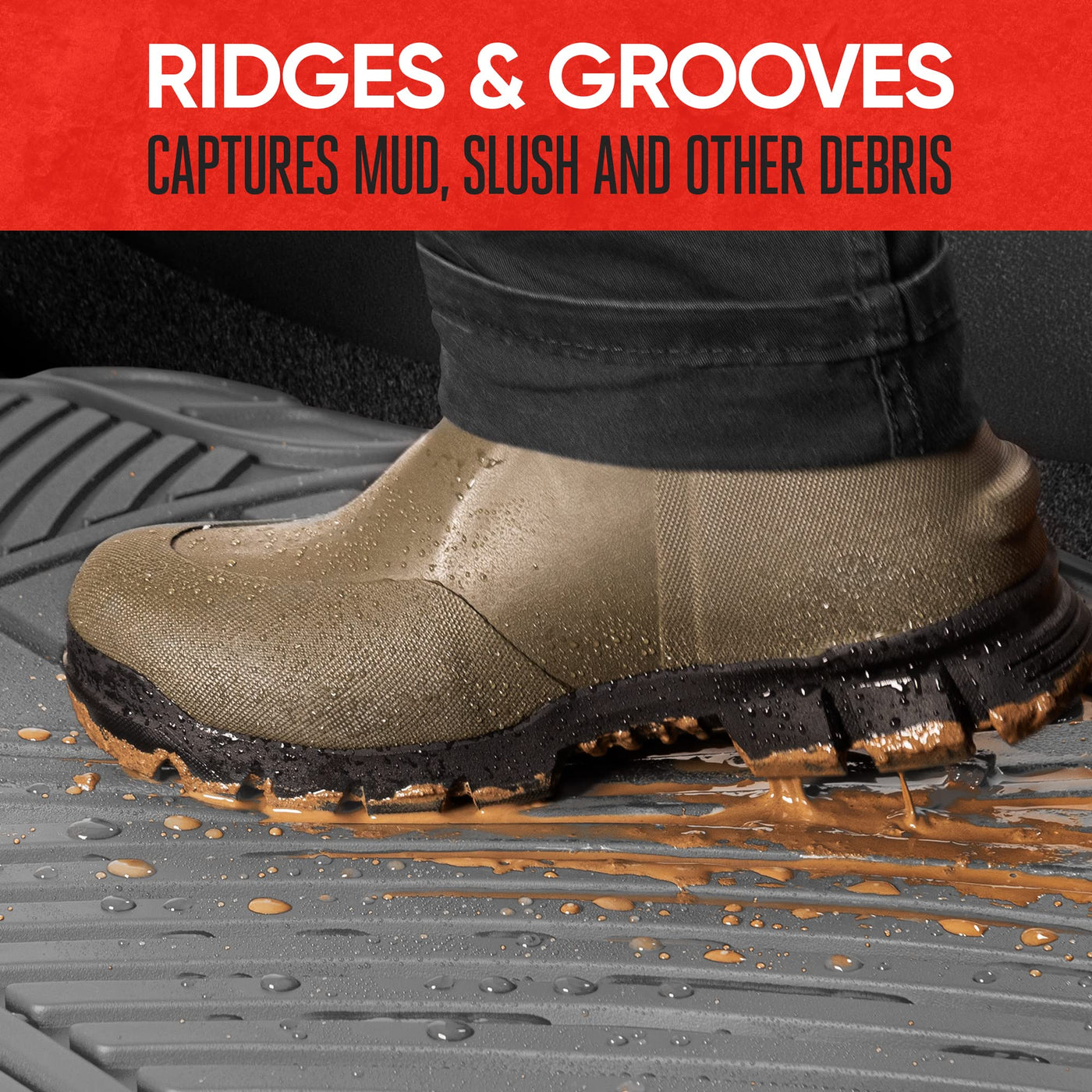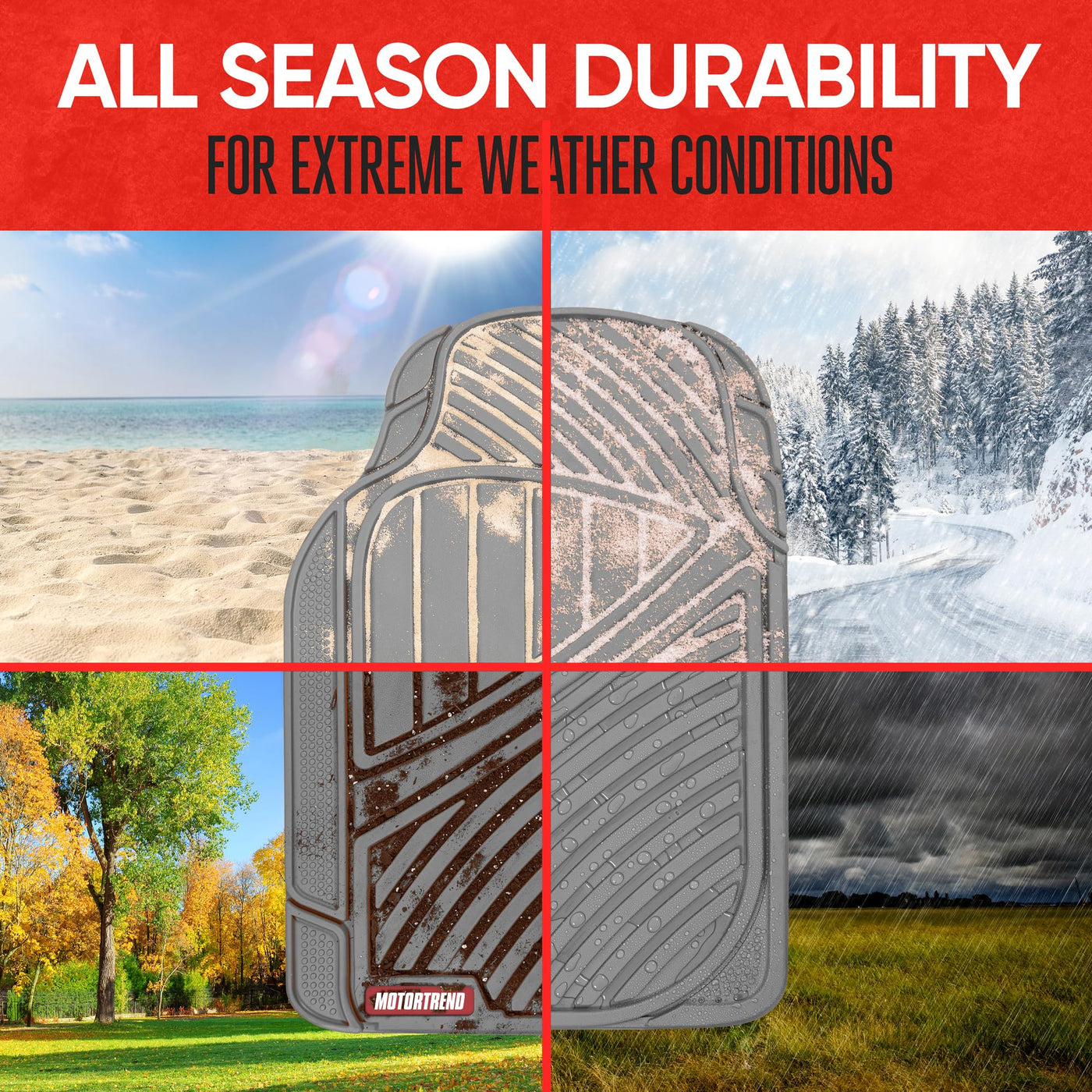 Q: What makes the Motor Trend FlexTough Performance Floor Mats suitable for all weather conditions?A: The Motor Trend FlexTough Performance Floor Mats are made from advanced performance rubber polymers that are tested for extreme conditions, ensuring they don't crack, split, or deform. This durability makes them ideal for protecting your vehicle's flooring from spills, stains, dirt, and debris in any weather.