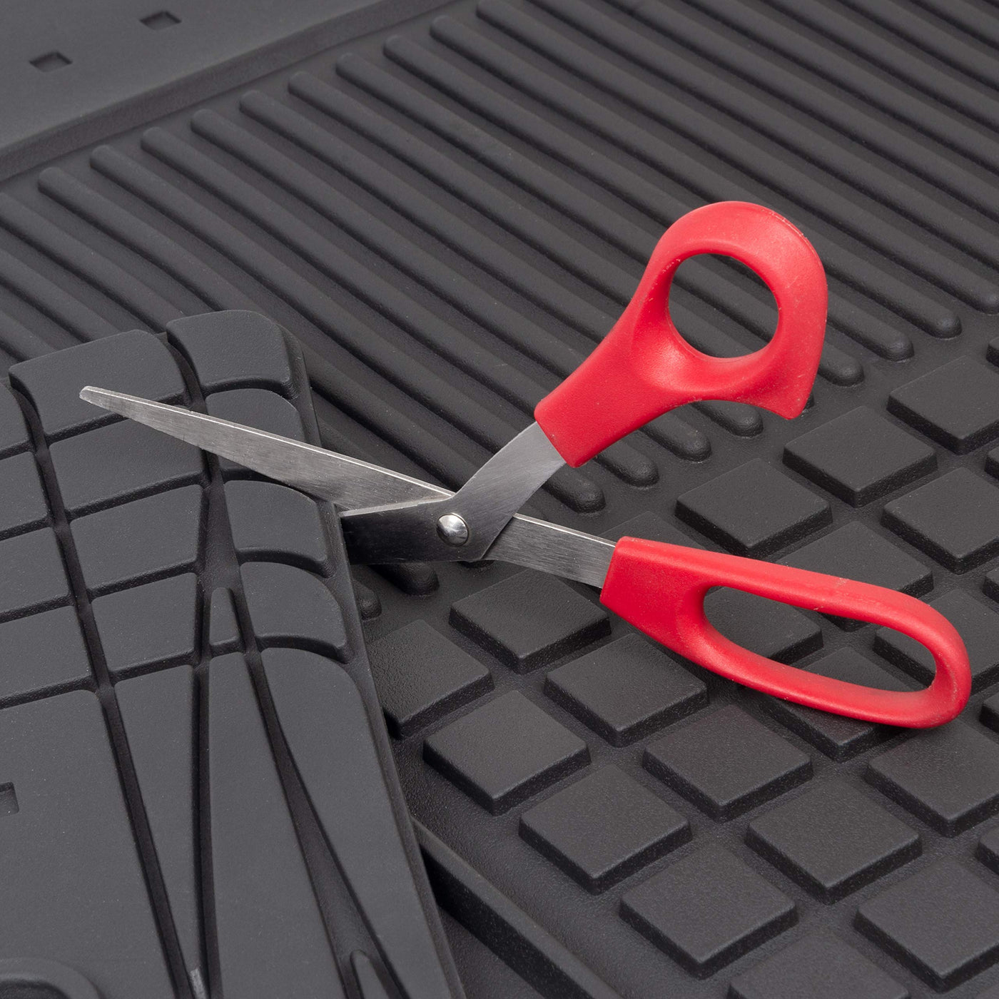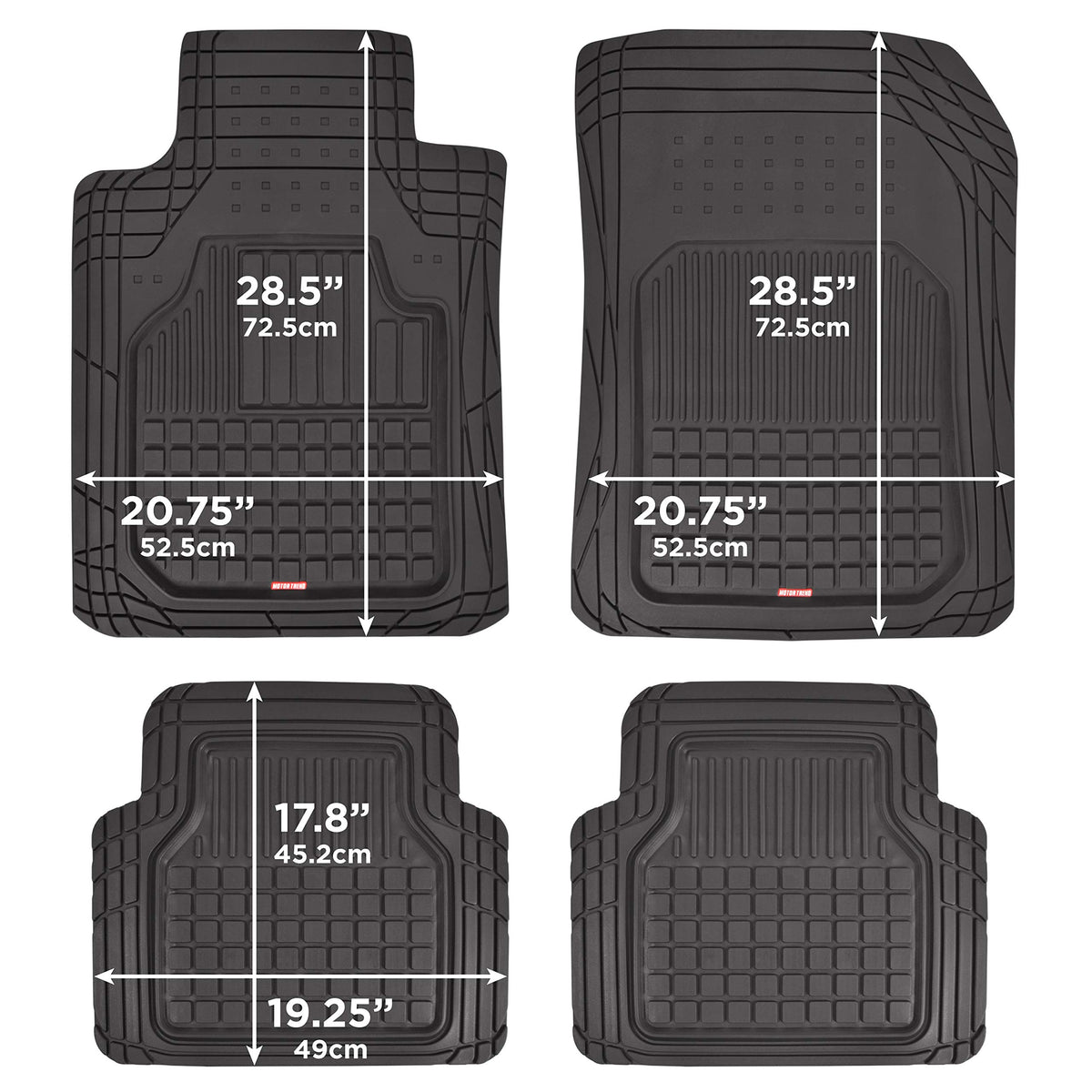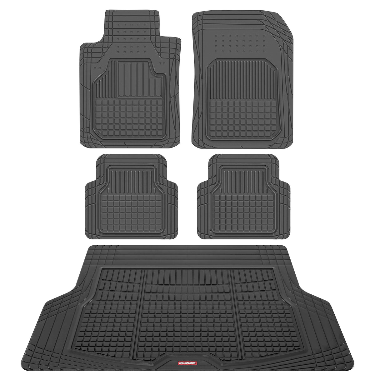 Motor Trend FlexTough Rubber Floor Mats and Cargo Liner - Full Set Heavy-Duty All-Weather Protection for Cars, Trucks, SUVs, and VansEquip your vehicle with the ultimate interior protection using the Motor Trend FlexTough Rubber Floor Mats and Rear Cargo Trunk Liner. This full set is designed to deliver heavy-duty performance in all weather conditions, ensuring your floors and trunk remain clean and well-protected. The set includes two front floor mats, one rear mat, and a cargo liner, offering comprehensive coverage for cars, trucks, SUVs, and vans.Constructed from high-quality, waterproof rubber, these mats and liner are engineered to withstand spills, mud, snow, and debris, keeping your vehicles interior spotless. The deep-dish grid and raised ridges effectively trap liquids and messes, preventing them from spreading. The non-slip backing ensures the mats and liner stay securely in place, providing safety and stability during every drive.The trim-to-fit design allows you to customize the mats and cargo liner to your vehicles specific dimensions, ensuring a snug and precise fit. Built to handle tough conditions, these mats are durable, long-lasting, and easy to clean-simply remove, rinse, and reinstall for hassle-free maintenance.Whether youre navigating harsh weather or tackling everyday messes, the Motor Trend FlexTough Rubber Floor Mats and Cargo Liner provide dependable, all-weather protection with a sleek and practical design. Upgrade your interior with this heavy-duty set for superior coverage, durability, and peace of mind.