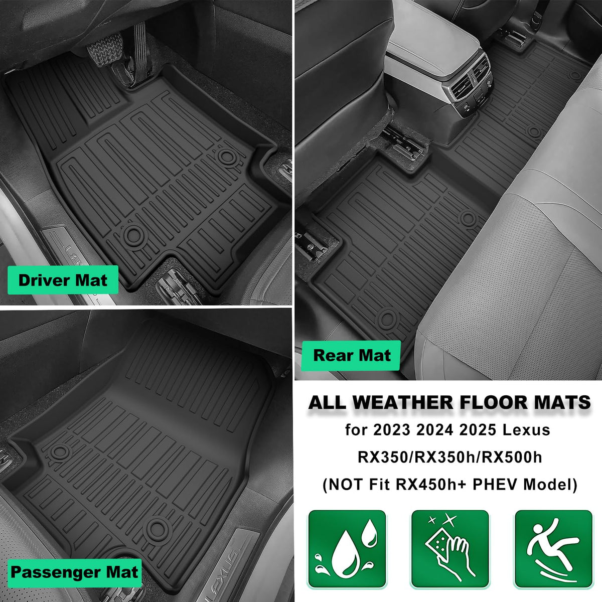 Q: Are these floor mats compatible with Lexus RX450h+ PHEV models?A: No, the Original 2023-2025 RX Floor Mats are specifically designed for Lexus RX350, RX350h, and RX500h models only. They do not fit the RX450h+ PHEV model.
