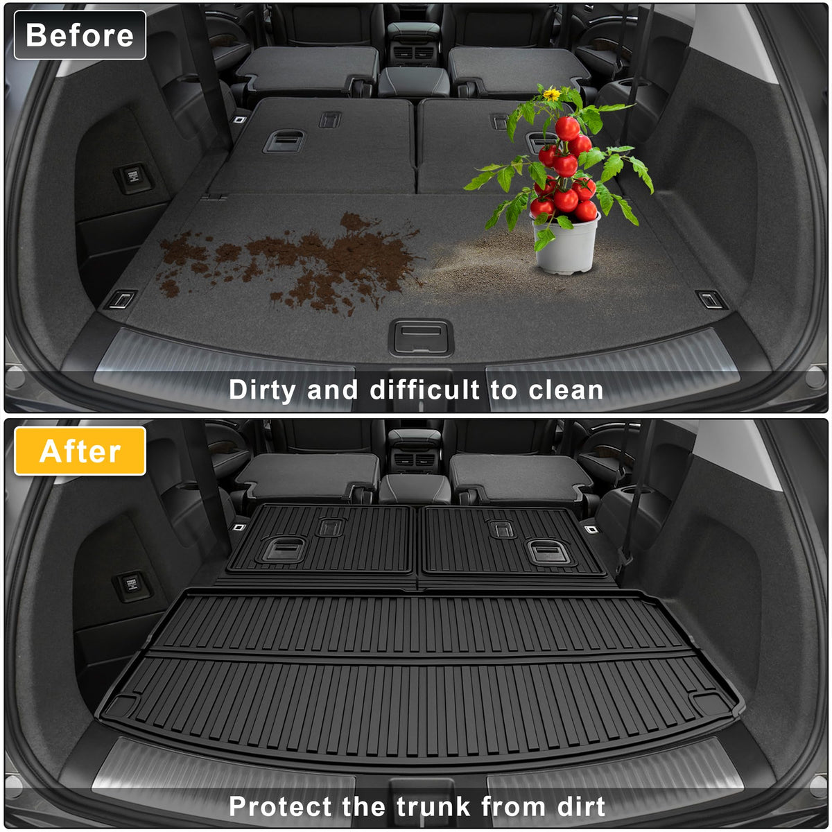 TTX Lighting mainly focus on high-quality products and provide you with high-quality cargo liners and back seat cover. Provide a clean and comfortable environment for your journey, keeping you happy.TTX Lighting cargo mat & backrest mat features:TPE material, odorless, high elasticity, recyclable,durable (PVC free)3D scanning data customization mold, designed to perfectly fit your car's foot pad, TPE rubber material is safe, wear-resistant, and easy to clean.Heavy-duty floor liner, which can resist any extreme weather without deformation and damageEasy to disassemble and install, easy to clean and maintainThe same buckle as the original car will fix the trunk liner. High-walled designHigh-walled design helps protect your car carpets from liquids, mud, rain, snow, etc., which will provide you with a comfortable, clean interior environment.Buckles & Anti-slipThe same buckle as the original car will fix the cargo liner. Good friction is formed between the floor mat and the body, and there will be no deviation during driving, ensuring you a comfortable foot feeling during driving.The package including:One cargo mat with backrest mat behind 3rd Row Back Seat Protector. Total 1 pieces.Thoughtful after-sales service:If you have any questions about the product, you are welcome to consult at any time, our customer service will be 7*24 hours online for you to answer!