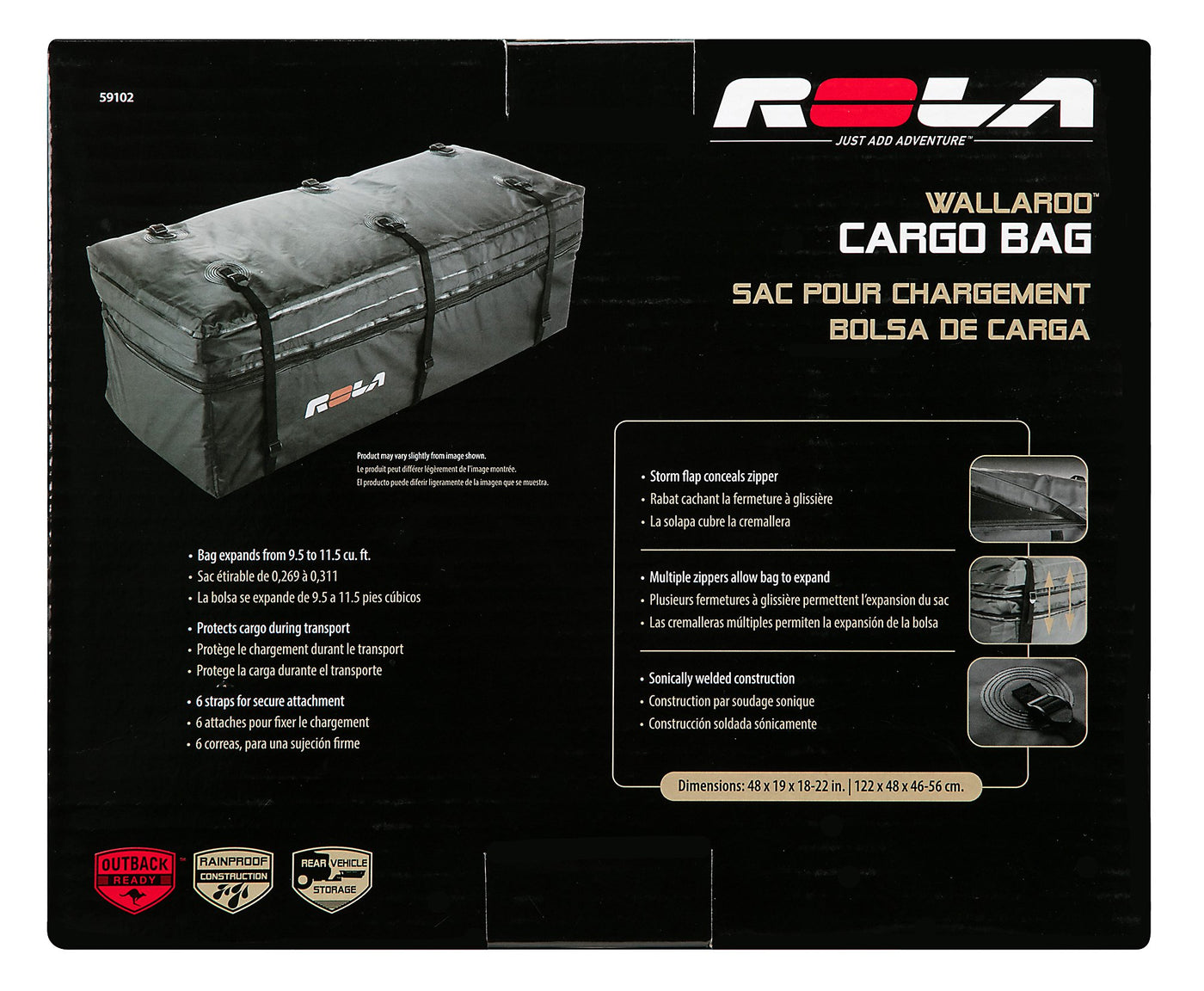 Q: What are the dimensions of the ROLA Wallaroo Cargo Bag when expanded?A: When expanded, the ROLA Wallaroo Cargo Bag measures 48 inches in length, 19 inches in width, and 22 inches in height, providing ample storage space for your gear and accessories.