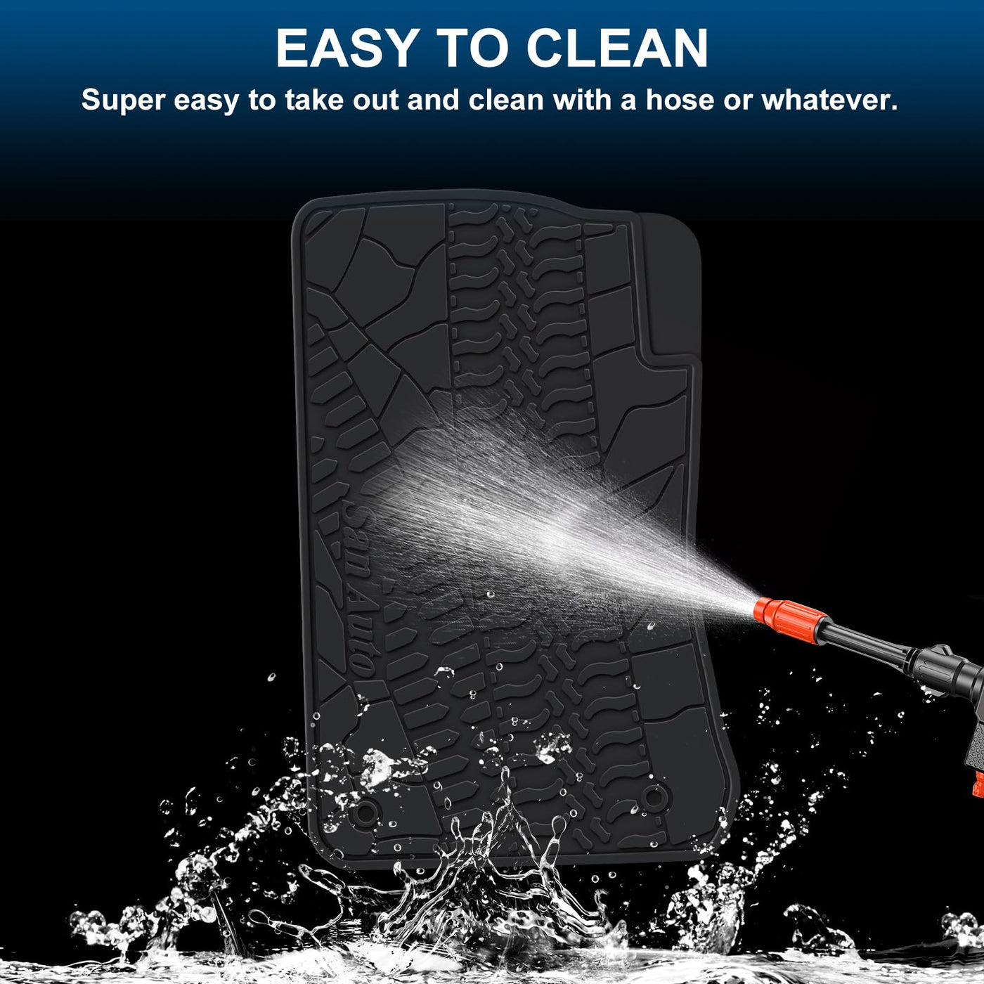 Appropriate Size & Adjustable: Size perfectly matches your beloved car; if you still need to change the size,can be trimmed with scissors to suit your vehicle which design with decorative line. | Easy To Clean & Durability Car Carpet: Clean the dirt and mud on the pad only by using a common hose; without maintenance, the durability of the product itself can be maintained for a long time. | All-weather Protection Car Floor Liners: The product is made from odorless rubber and is designed to prevent the deformation of high temperature or low temperature. The surface is like a tire pattern design, which can enhance the anti slip function. | High Quality Material & Tasteless: The product uses high quality rubber material, has the corrosion resistance and not easy to deform the characteristic, will not bring the peculiar smell in the vehicle, maintains the vehicle environment air fresh. | Strong Grip & Safety Upgrade: Product adhesion is strong, can be effectively fixed on the floor, the use of the process is not easy to shift, safe and more secure.