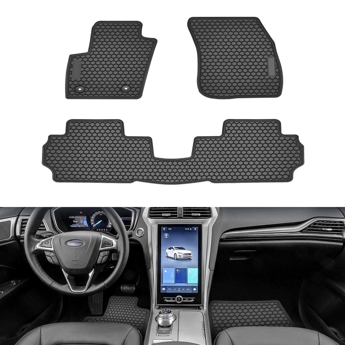 TeddyTT floor mats are very soft & waterproof which offer your Ford Fusion full coverage protection and excellently work great in all seasons. Get These Awesome Mats to Upgrade your car. Fitment: Custom designed to fit for Ford Fusion 2013 2014 2015 2016 2017 2018 2019 2020 2021. Material: 1. Made of odorless and durable Environmental natural latex(Rubber) material which provide great floor protection. 2. The Latex construction mats are soft enough can be easily flattened and folded, will never harden, crack or curl. Nice Design: 1. Unique black color style and 3d honeycomb pattern design, non-slip and improve your Ford Fusion interior look. 2. Deep grooves and ridges which will trap moisture, preventing any spill over. 3. Raised edges give maximum coverage the foot rest and the hump. Great Function: 1. Our rubber floor mats are effective for water, flame, snow, mud and dirt or any liquids, improving ride safety and keeping your car tidy and clean. 2. Minimizes foot fatigue and provides the sound barrier for a quieter ride. Easy to install and clean: 1. Just put on and cover the Front and Rear seat floor area. It only take minutes. 2. Simple to Clean: It's very easy to clean with a wet towel or water wash away the stain. 3. Notice: Regular cleaning will help maintenance and can greatly prolong the lifespan of your vehicles interior. Package Include: 2 PCS Front Seat Floor Mats 1 PCS Rear Seat Floor Mat .