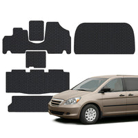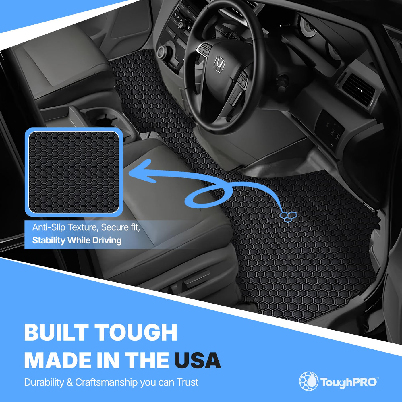 Upgrade Floor Mats for your Honda Odyssey 2005 - 2010 model with TOUGHPROs all-weather, heavy-duty black rubber floor mats-specially designed to provide maximum coverage and interior protection. Whether you are facing mud, snow, spills, or everyday wear, these custom-fit mats ensure your vehicles flooring stays clean and damage-less.Made with advanced 3D scan technology, these mats are precisely cut to fit the 1st, 2nd, 3rd rows and cargo mats, providing a perfect fit for your vehicle. The tough, non-slip surface keeps the mats in place, while the deep grooves and raised edges help catch dirt, water, and debris.Key Features:Custom-Fit Precision.All-Weather ProtectionHeavy-Duty Protection.Sleek Black FinishAnti-Slip BackingRaised Edge DesignEasy to Clean & Maintain. Our Mission: We are dedicated to providing top-quality, custom-fit car floor mats that offer strong protection, long-lasting durability, and dependable performance. Our aim is to keep your vehicles interior clean and looking great with heavy-duty, all-weather mats made to handle tough use. By focusing on accurate fit, great design, and smart features, we make sure every mat delivers long-term value and customer satisfaction.