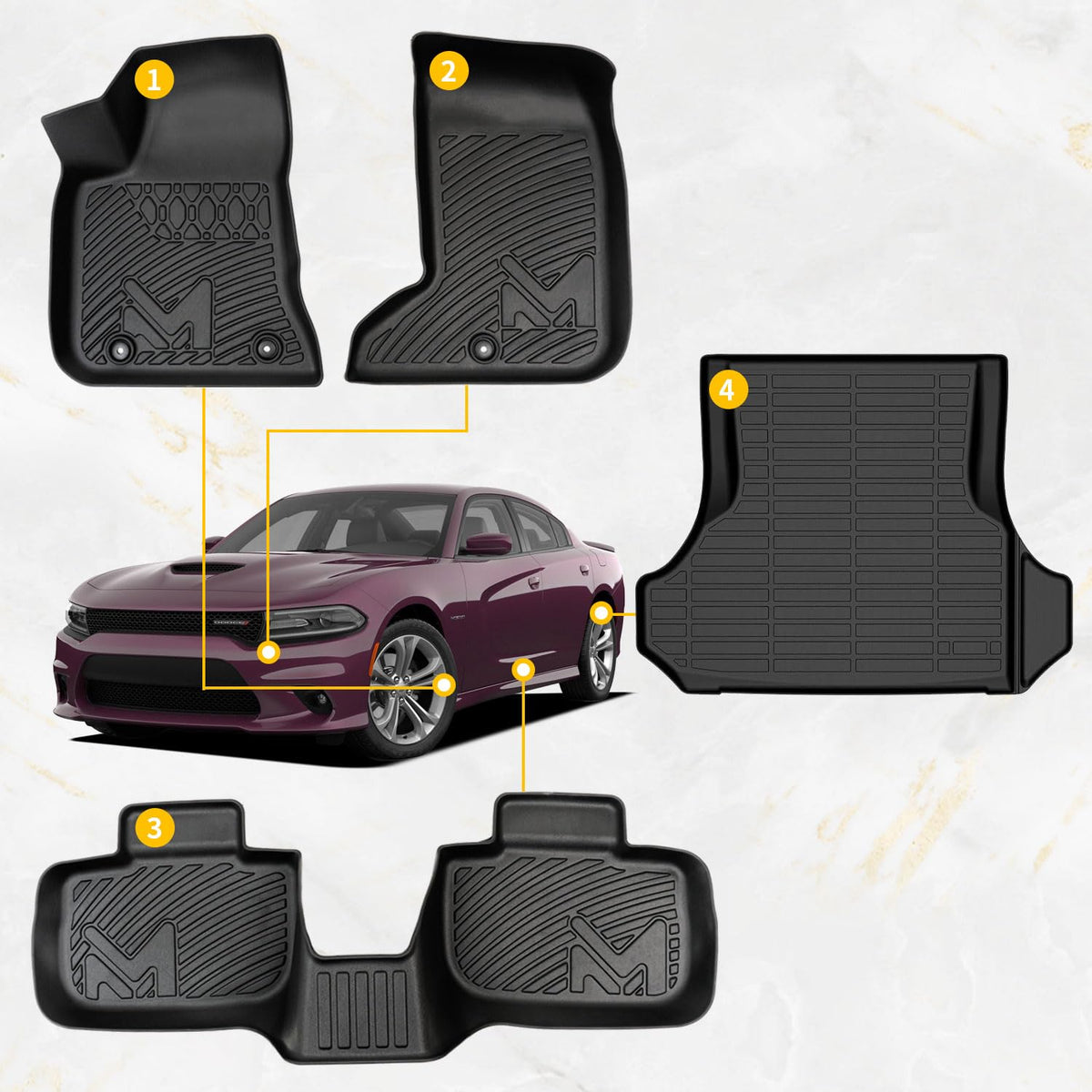 Q: Are these floor mats compatible with my 2011 Dodge Charger AWD?A: Yes, these TPE automotive floor mats are specifically designed to fit 2011-2023 Dodge Charger AWD models, ensuring a custom fit for your vehicle.