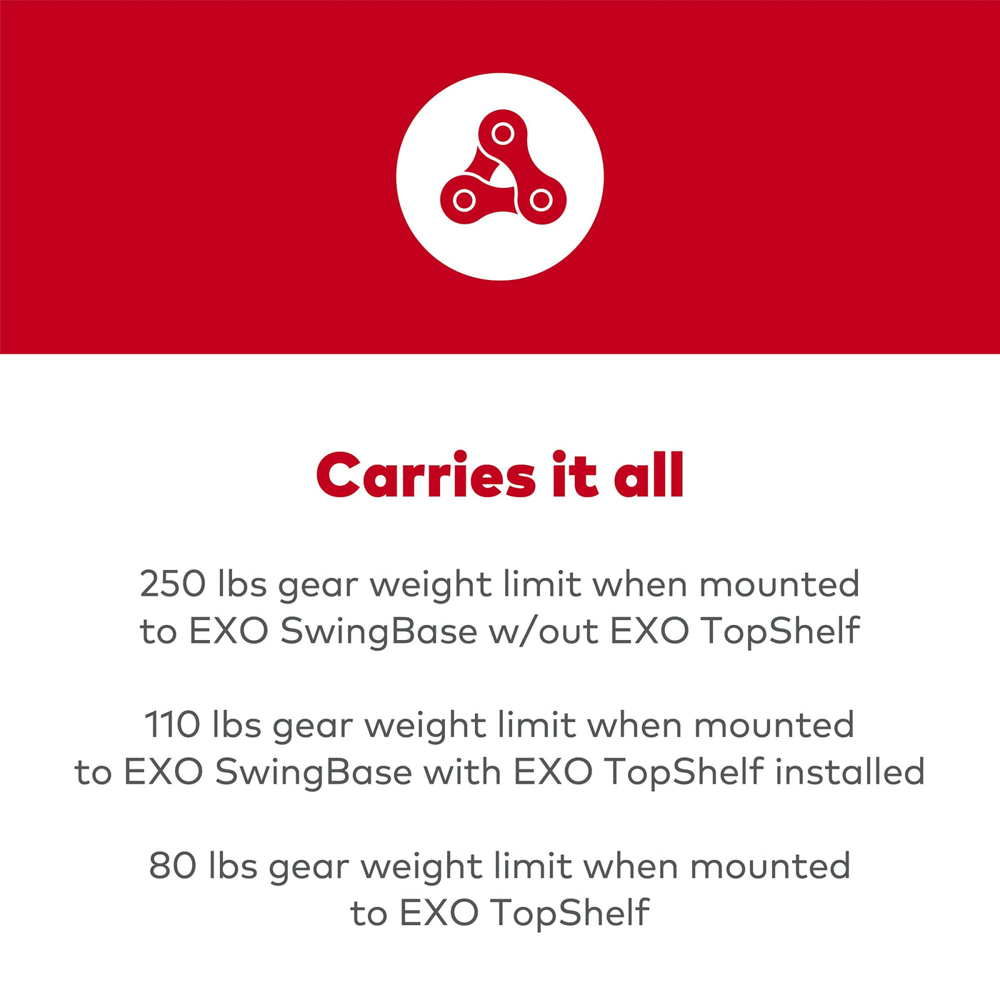 Q: What is the weight capacity of the Yakima EXO GearWarrior?A: The Yakima EXO GearWarrior has a weight capacity of 250 pounds when mounted on the EXO SwingBase without the EXO TopShelf. If the EXO TopShelf is installed, the weight limit is 110 pounds, and when mounted solely on the EXO TopShelf, the limit is 80 pounds.