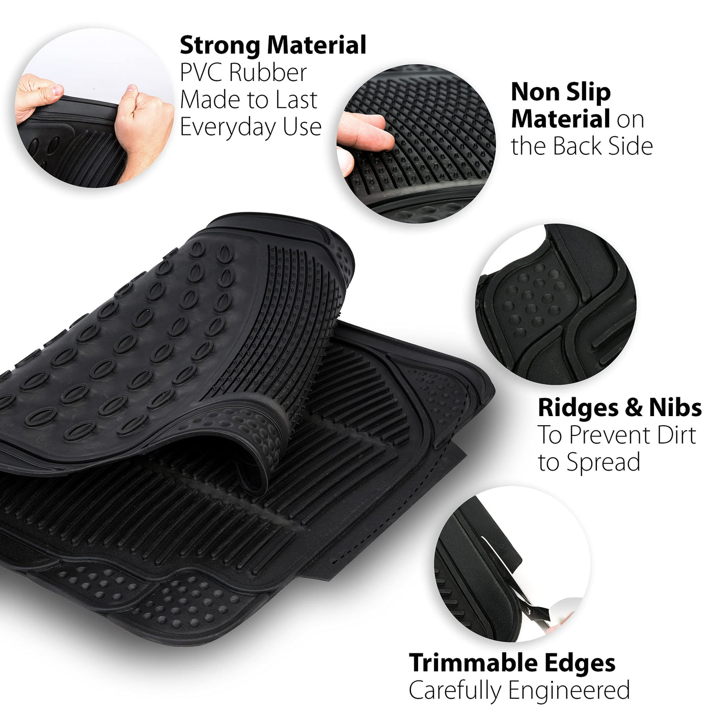 Zonetech All Weather Rubber Car Interior Floor Mats 3-Piece Trimmable Waterproof Odorless Black Heavy Duty Universal Fit