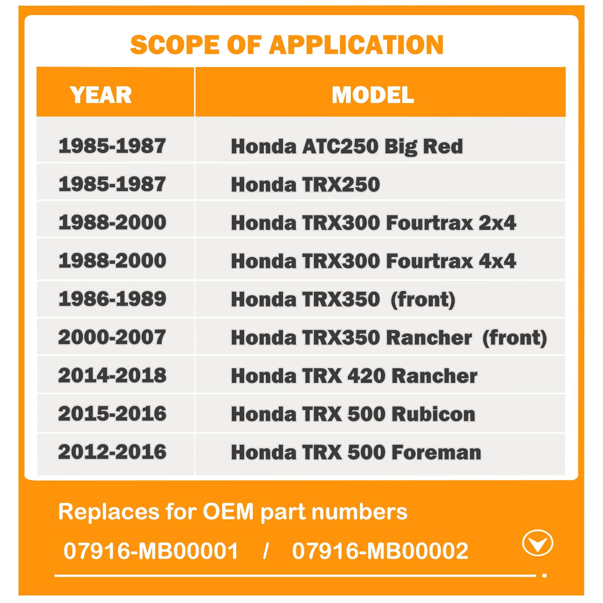 Q: What Honda models are compatible with the 60mm Differential Pinion Lock Nuts Tool?A: The 60mm Differential Pinion Lock Nuts Tool is compatible with various Honda models including the ATC250 Big Red (1985-1987), TRX250 (1985-1987), TRX300 Fourtrax (1988-2000, both 2x4 and 4x4), TRX350 (1986-1989), TRX350 Rancher (2000-2007), TRX 420 Rancher (2014-2018), TRX 500 Rubicon (2015-2016), and TRX 500 Foreman (2012-2016).