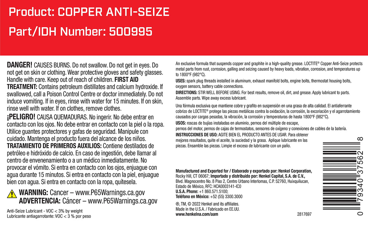 A premium quality copper anti-seize and thread lubricant that may be used to prevent seizing, corrosion and galling where high temperature conditions exist. Temperature range: -30F to 1800F. Provides good electrical conductivity.