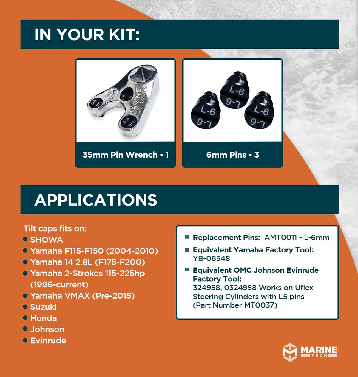 Marine Tech Tools 35mm Outboard Pin Wrench (AMT0009) with L-6 Pins, Tilt Cap Removal tool, Tilt Caps fit SHOWA Manufactured Unit