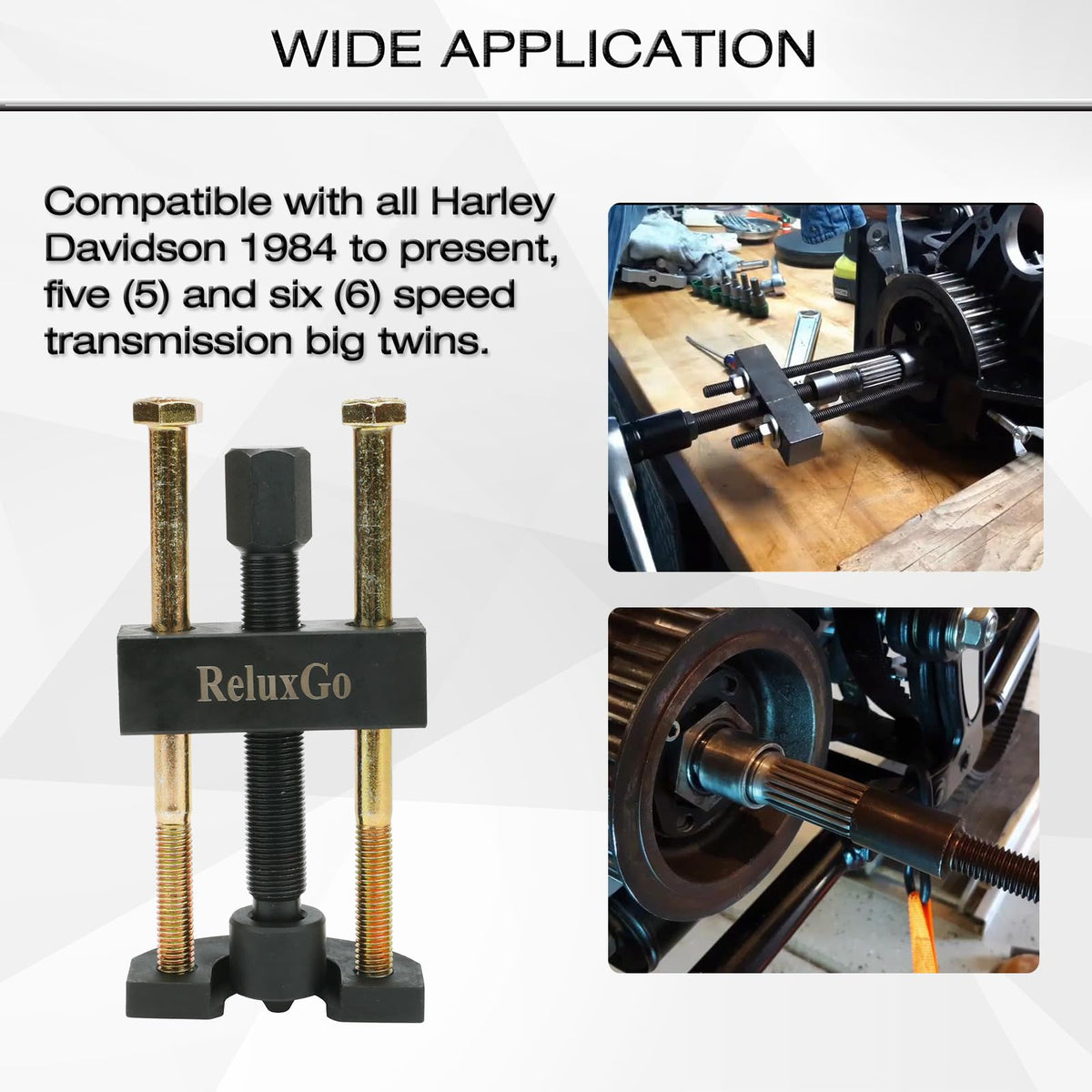 Q: What is the purpose of the ReluxGo Transmission Mainshaft Inner Bearing Race Tool?A: The ReluxGo tool is designed to easily remove and install the mainshaft inner bearing race on Harley Davidson Big Twin 5 and 6 speed transmissions from 1984 to present. It replaces the original puller for Harley part # 34902-84, providing a more efficient solution for maintenance tasks.