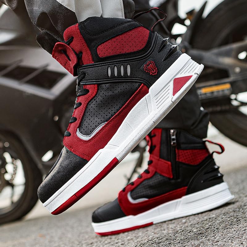 Bofucn Motorcycle Leather Boots,Street Riding Shoes,Anti-Slip Side Zipper Shoes For Men And Women (Black/Red, Adult, 12.5 Men/14