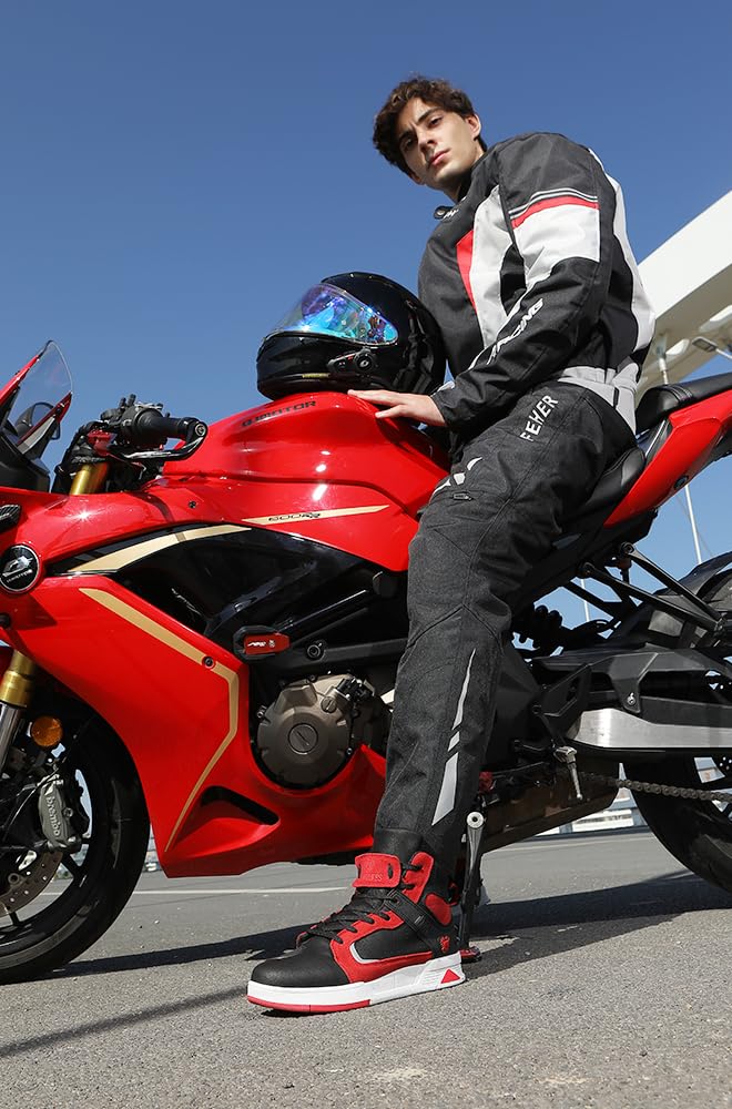Bofucn Motorcycle Leather Boots,Street Riding Shoes,Anti-Slip Side Zipper Shoes For Men And Women (Black/Red, Adult, 9.5 Men/11