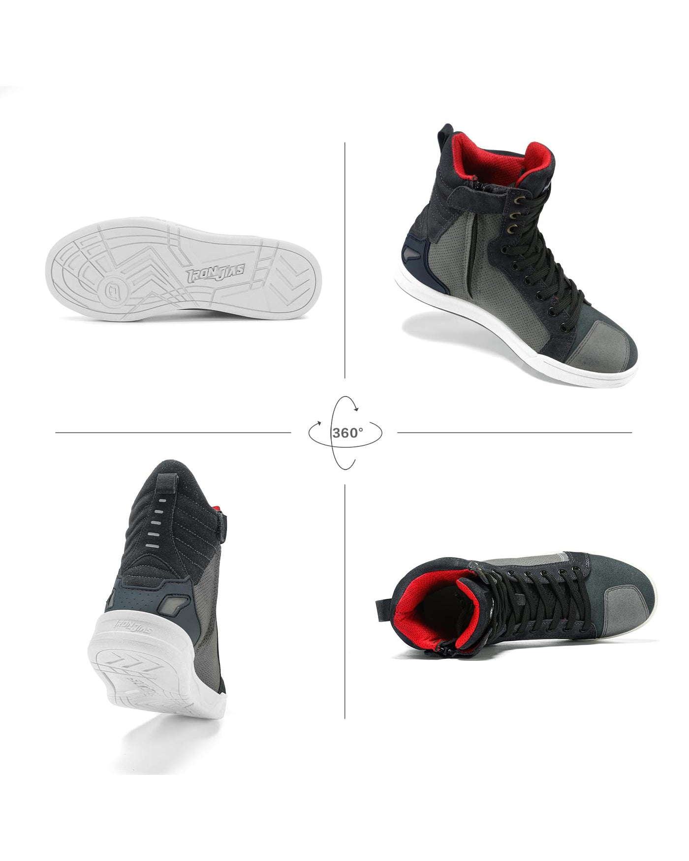 1.Motorbike shoes have street-styled upper combining tenacity breathable fabrics for optimized comfort,durability and look.Casual styling and protective features make the motorcycle riding shoes a great option for any rider. | 2.Impact-resistant boots keep the rider safe.The ankle and heel have PP protective shell to provide all-round strategic protection and flexibility in key areas. | 3.Motocross protective boots,extra thickened toe cap,with microfiber gear shifter protection,wear-resistant,using for gear shift,protect the shoes.Quality protective gear is imperative while out riding a motor bike. | 4.Casual motorcycle shoes, upgraded sole, the sole is made of rubber with anti-skid and wear resistance for improved the durability of boots,gives greater stability. And Upgraded Reflective strip, provide higher safety for your riding. | 5.The high top motorcycle shoes are used the side zipper design,make putting on and taking off fast and easy, no longer need to tie your shoelaces frequently,secure and comfortable fit.