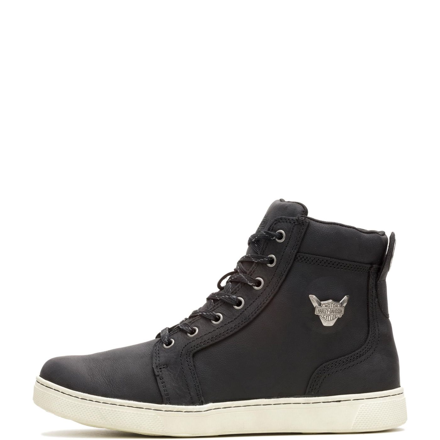 Q: What materials are used in the HARLEY-DAVIDSON FOOTWEAR Men's Bateman motorcycle sneakers?A: The HARLEY-DAVIDSON FOOTWEAR Men's Bateman riding sneakers are constructed with high-quality full grain leather for the upper, and feature a breathable mesh lining for comfort. The outsole is made from a distressed rubber material, providing both durability and style.