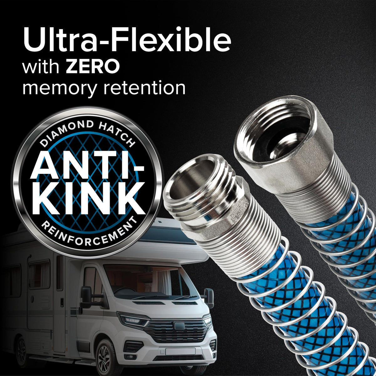 Q: How does the anti-kink design work on this hose?A: The hose features a diamond-hatch reinforcement that enhances kink-resistance, along with machined fittings and strain-relief ends. This design prevents kinking and ensures durability during use.