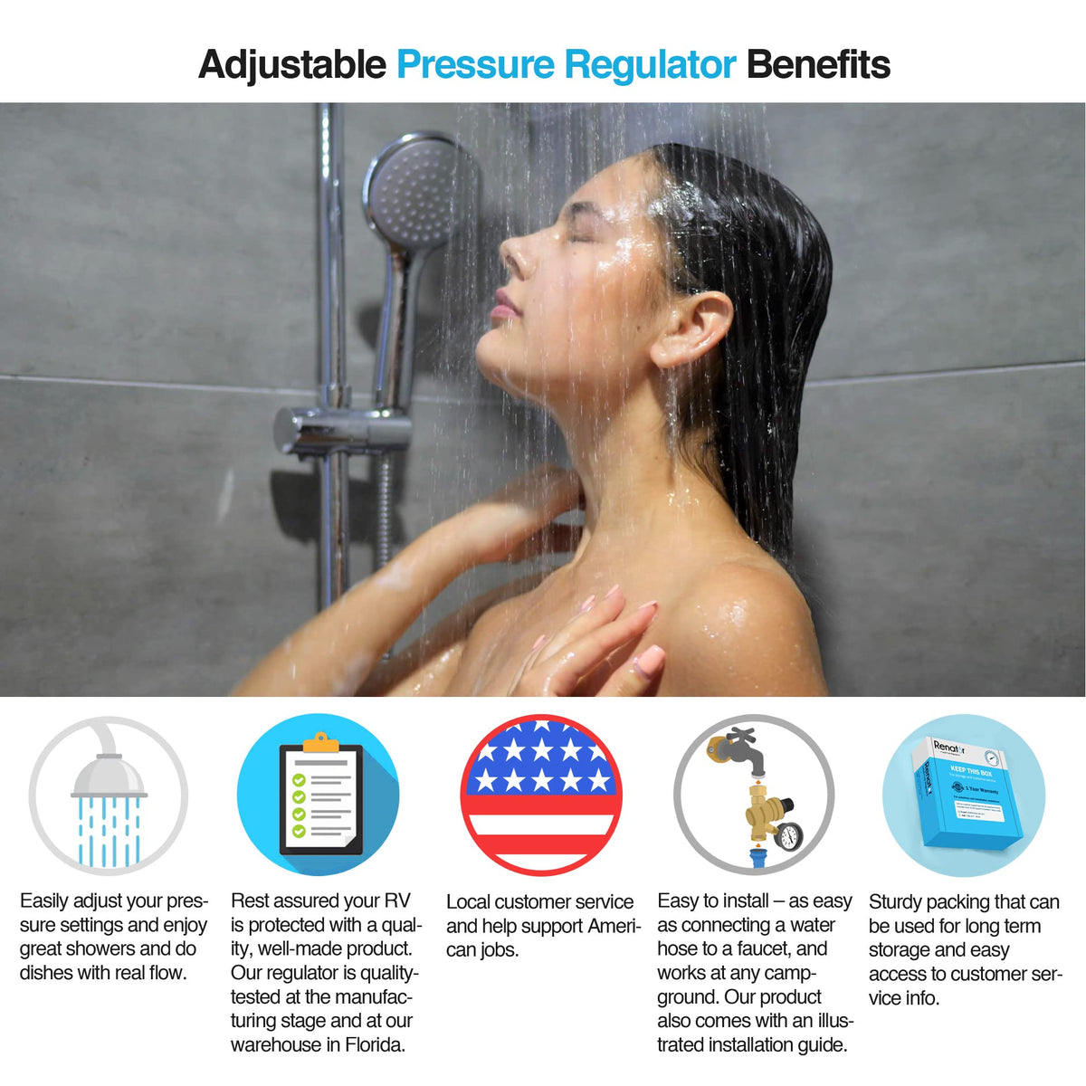 This Regulator Is Quality Tested In The Us Using American Standards, Is Made With Brass And Contains A More Durable, Liquid-Filled Gauge. Easy To Install, Easy To Use. Effortlessly Adjust And Monitor Your Water Pressure, And Enjoy Strong Showers And Good Water Flow, While Having The Peace Of Mind Knowing Your Rv Is Protected From High Water Pressure. Installation Is As Easy As Attaching A Water Hose (Each Product Comes With An Illustrated Guide). 1-Year Warranty And U.S.-Based Phone And Email Support. Renator Is One Of The Only Companies Based In The Us; We Do Both Secondary Quality Control In Our Florida Warehouse, And Offer Lifetime Local Phone And Email Support Because We Stand Behind Our Product. The Regulator Is Made Out Of Heavy Duty Brass, The Gauge Is Made Of Stainless Steel And Contains Silicone Oil To Reduce Friction Of Internal Components And Significantly Increases The Life Of The Product. Low Lead. Each Batch Of Regulators Is Tested To Contain Less Than .13% Lead, Well Under The Nsf Requirements Of .25%. The Regulator'S Inlet Screen Also Helps To Filter Out Debris And Other Impurities. Ready To Use And Universally Compatible. The Regulator Is Compatible With All Us Water Sources, Including 3/4'' Garden Hose Threads And Nh Threads, And Is Preset At 45 Psi. It Is Adjustable Up To 160 Psi- We Recommend Referring To Your Rvs Manual For Optimal Settings. Quality Packaging. The Regulator Arrives In A Durable Padded Cardboard Box That Can Be Used For Long-Term Storage, And For Handy Access To Our Customer Support. An Illustrated Installation Guide Is Also Included.