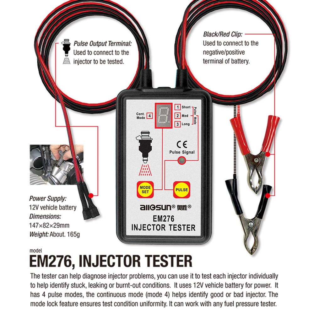 Q: What features make the EM276SET Fuel Injector Tester effective?A: The EM276SET features 8 pulse modes and 4 different pulse signal output modes, allowing for versatile testing of fuel injectors. Its large LED display provides clear visibility, and the long power and output cables are made of high-quality silicone for durability in various conditions.